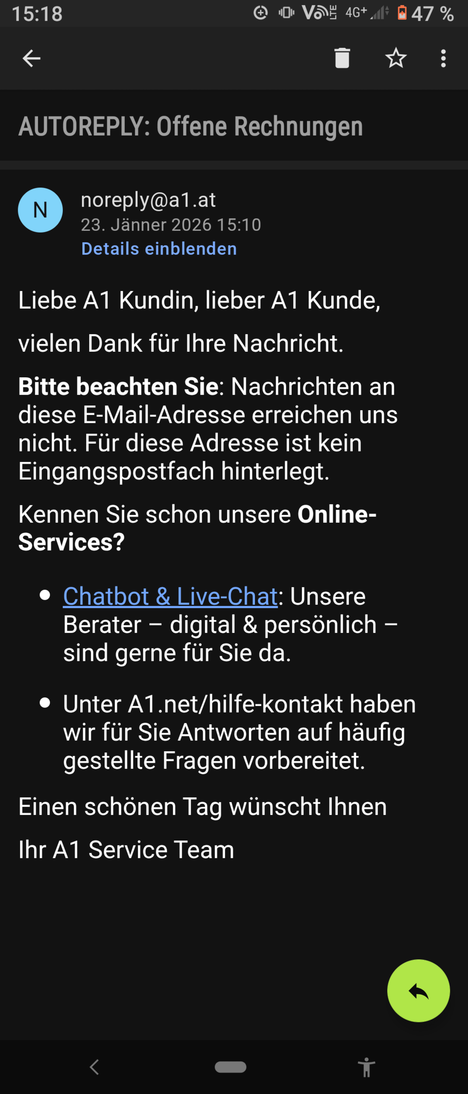 Eskalier komplett mit dem Chatbot, dann kriegst ein Menschi am anderen Ende.