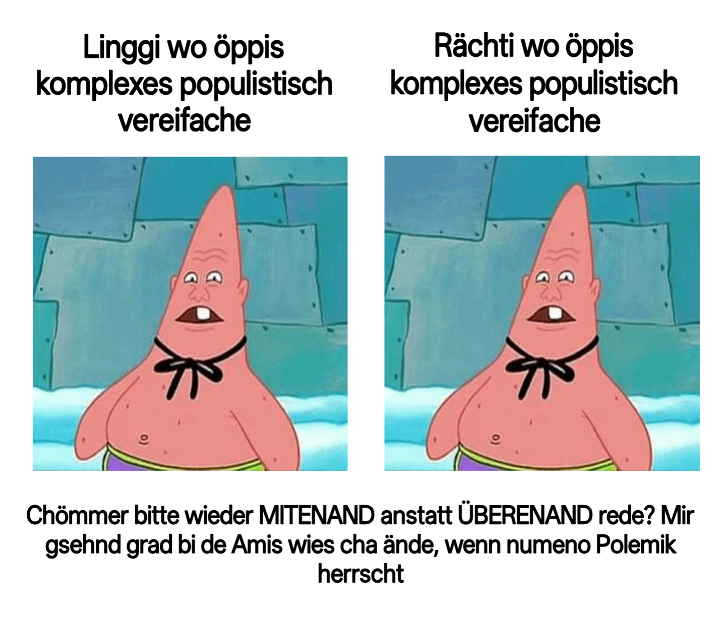 Genrell de Migration t schuld für alles ge und geld für alles zum Fenster usrühre usert für die breit Bevölkerig (höchi mieti, Gesundheits chöste/ nei beides isch nöd eh Migrationa frag)