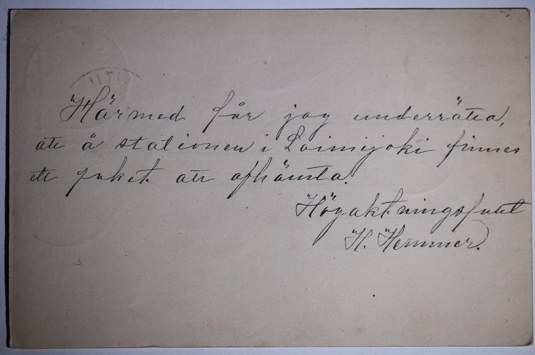 Härmed får jag underrätta, att å stationen i Loimijoki finnes ett paket att afhämta.