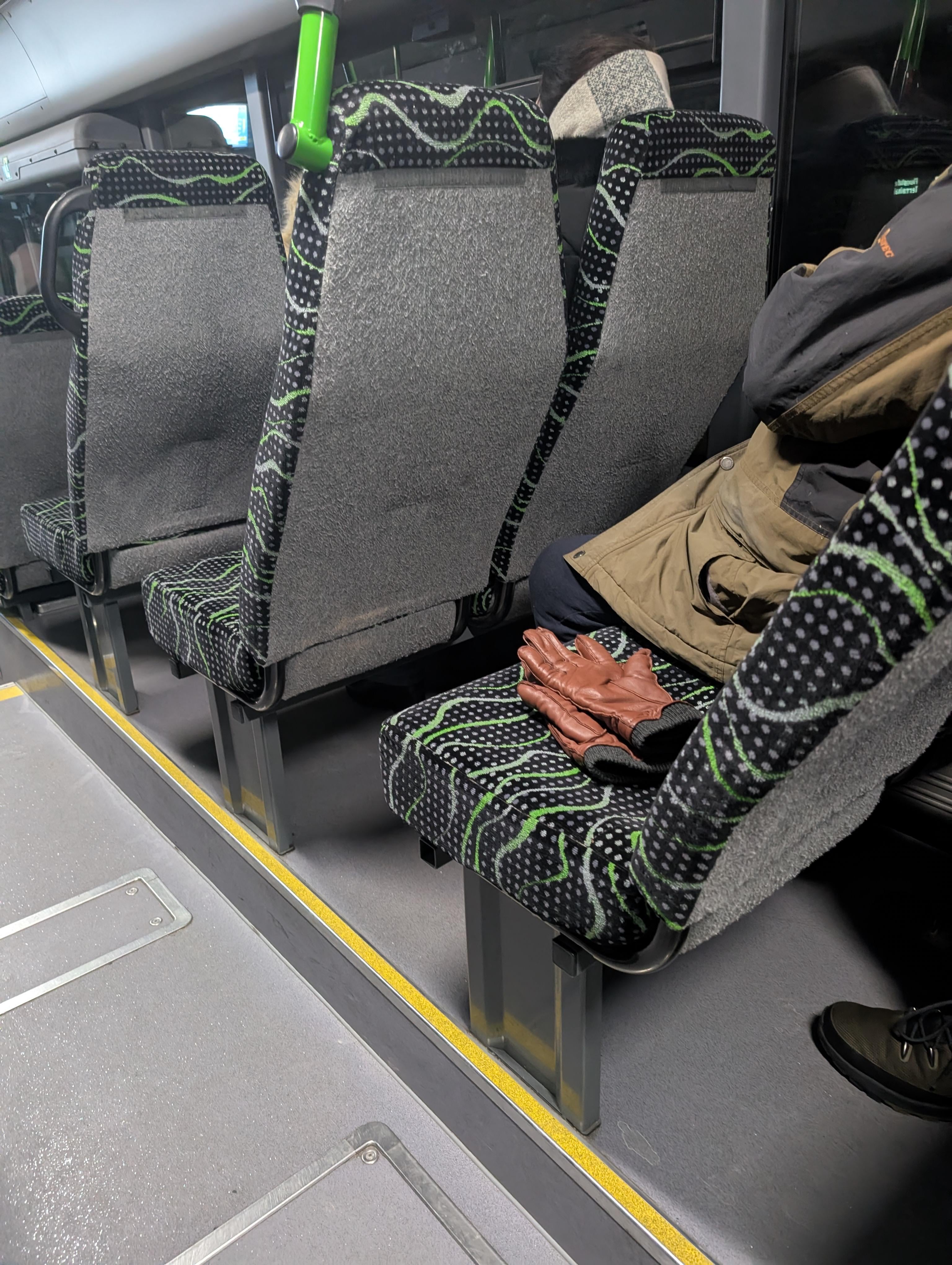 I do not see the problem. The train appears to be rather empty. Why should he be bothered about where to put his gloves? On an empty train, I always put my backpack on the seat right next to me, but once more and more people get on the train, I put it on my lap. It is wintertime, and people have a lot of clothes on, and sometimes it does not feel very comfortable to put gloves in my pocket.