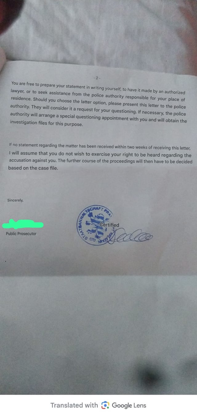 2. Since you used google translate to read this letter, I’d recommend you getting a lawyer to review the letter and possibly get Akteneinsicht-access to the case as well as to help you with next steps. Do NOT lie to your attorney.