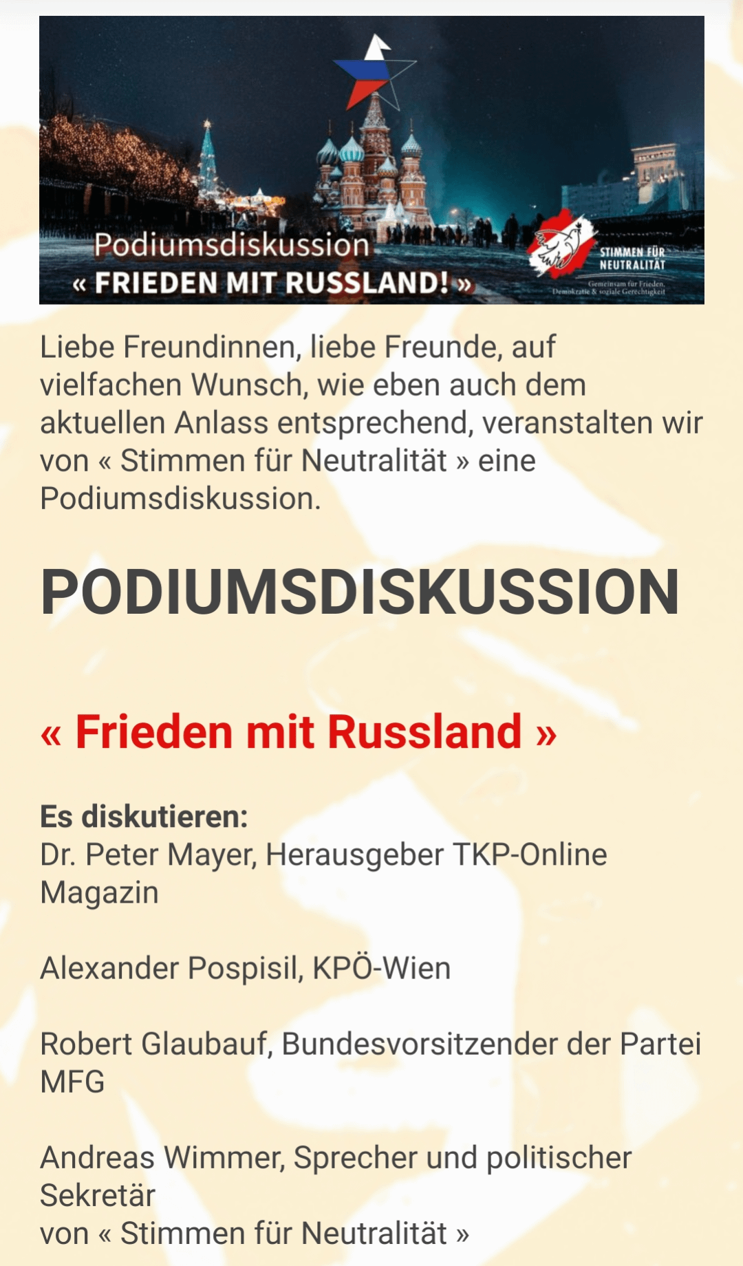 Die Vortragenden, wie auch die Diskussion, sollen sich über den westlichen Krieg in der Ukraine gegen Russland und die damit verbundenen umfassenden, wie auch weitreichenden Konsequenzen befassen.