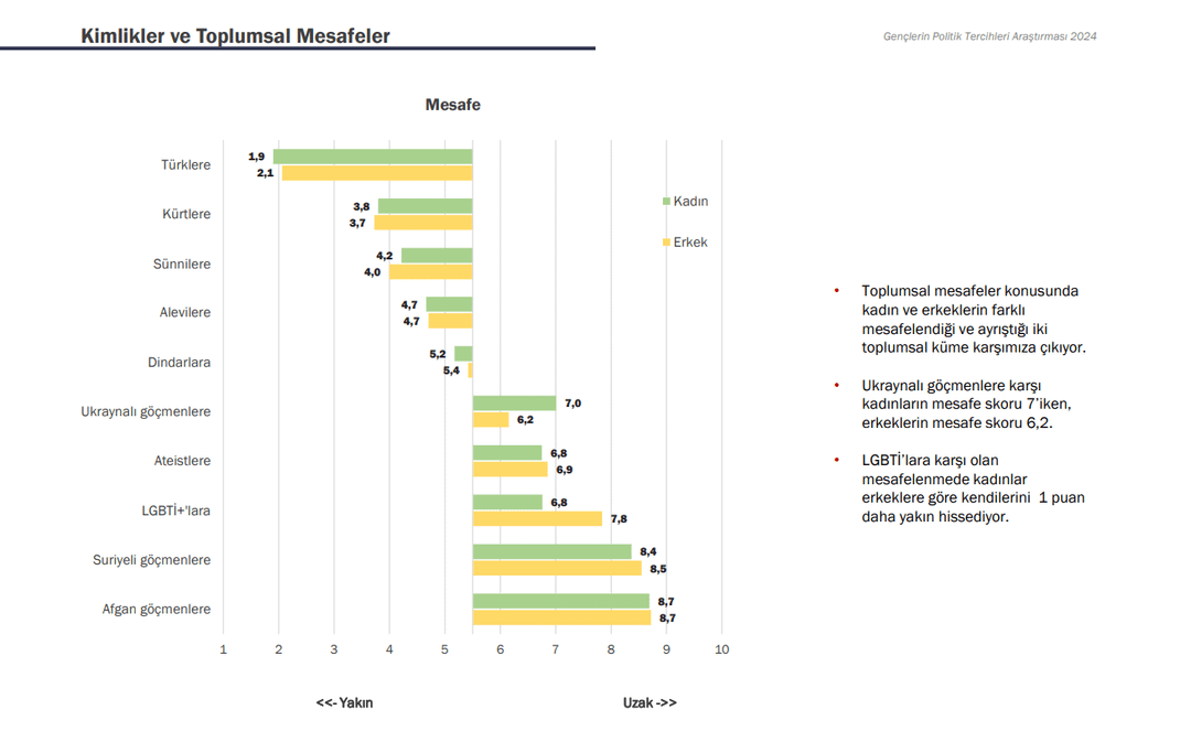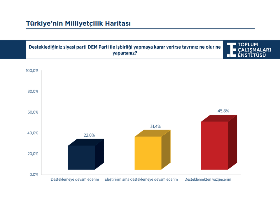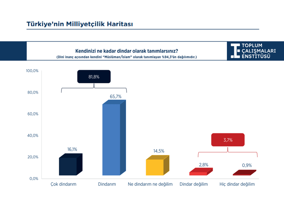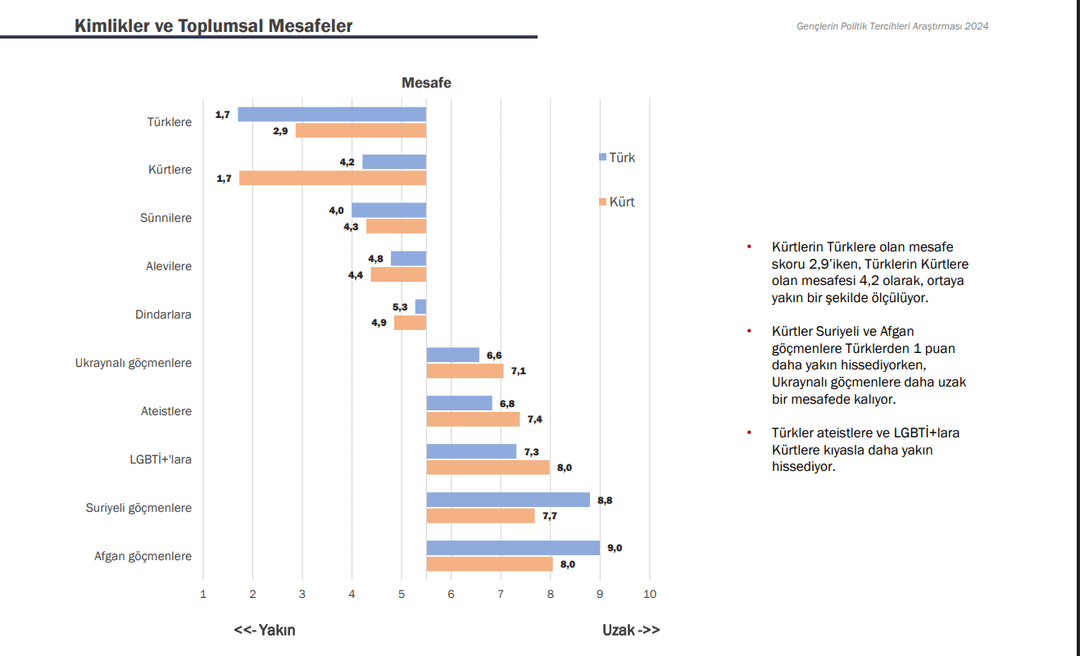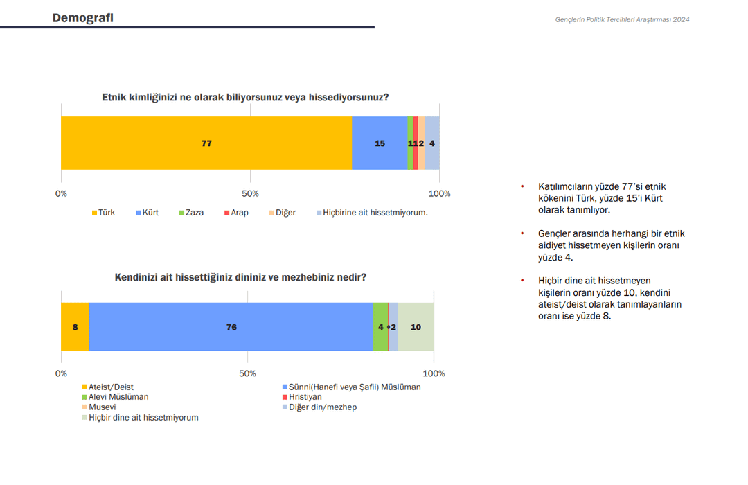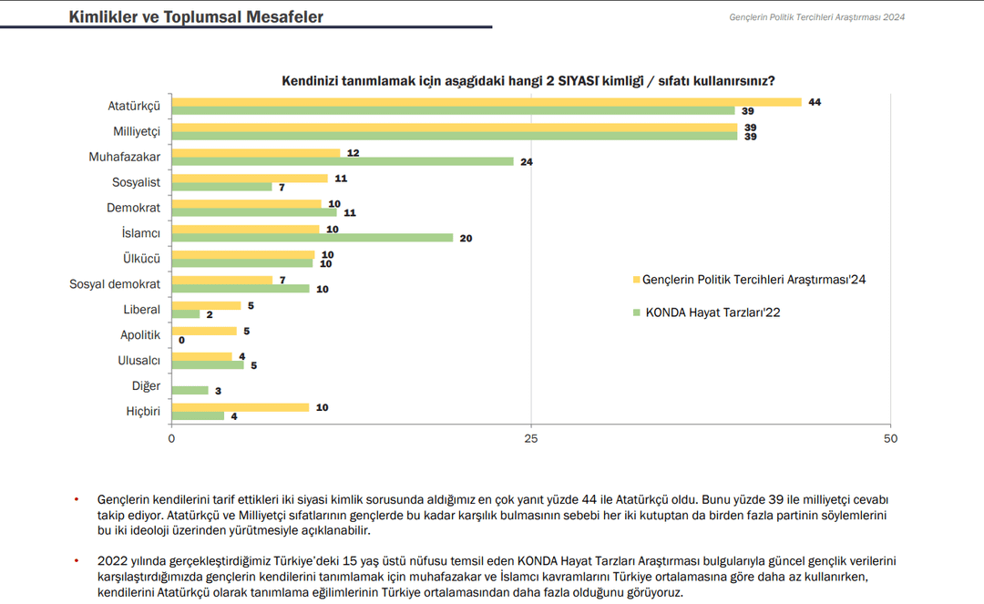 2- Sonraki anket ise GoFor ve KONDA iş birliğiyle 18-30 yaş arası gençlerde gerçekleştirilmiş. Kendini Atatürkçü ve Sosyalist tanımlayanların oranı sırasıyla %44 ve %11 olup yükselişte iken Muhafazakar, İslamcı ve Sosyal Demokrat oranlarının azalması göze çarpıyor. Ankete göre gençlerin %77'si kendini Türk, %15'i ise Kürt olarak tanımlıyor. Anket Kürtlerin kendilerini Türklere, Türklerin Kürtlere hissettiğinden daha yakın hissettiğini de ortaya koymuş.