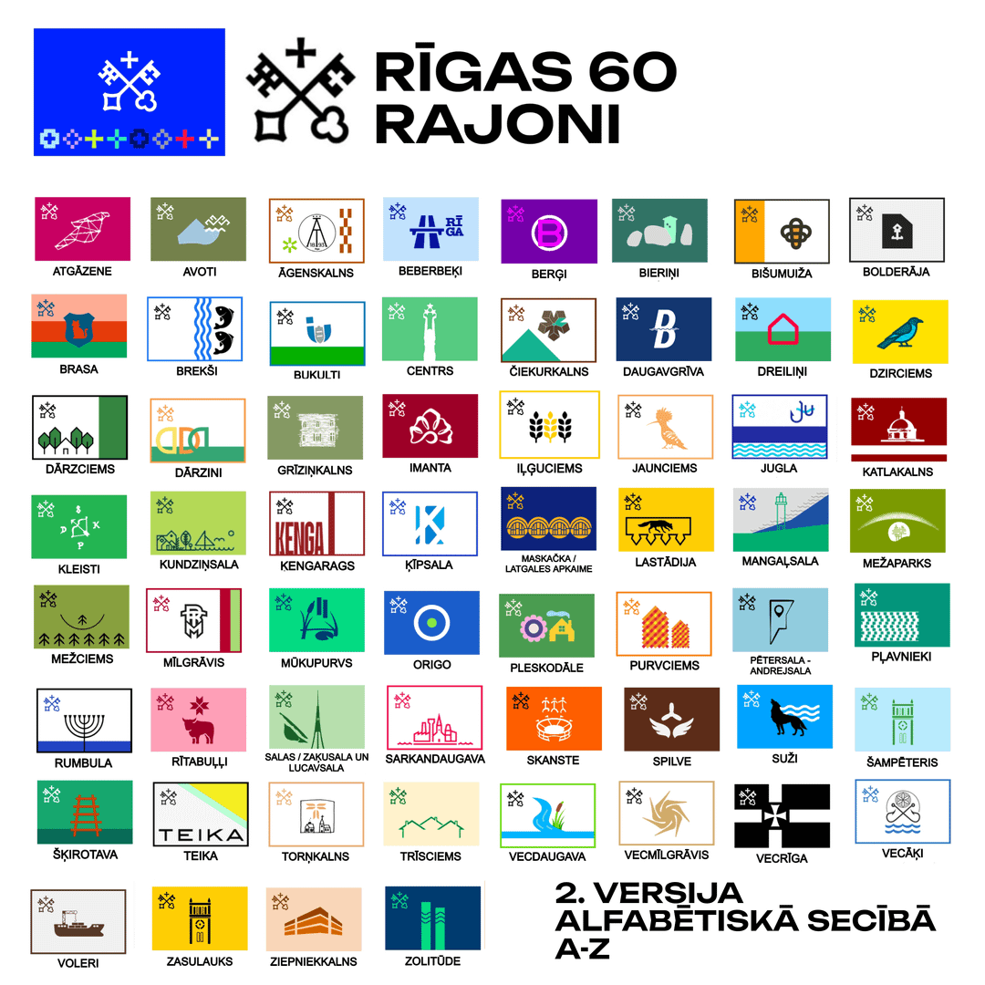 Pirmajā versijā es biju izveidojis unikālus karoga dizainus visiem Rīgas 58 rajoniem kā radošu ideju, kas ļoti daudziem cilvēkiem patika (var redzēt manā profilā), un balstoties uz pāris cilvēku ieteikumiem, esmu izveidojis otro versiju šim ļoti foršajam projektam ar pāris karogu uzlabojumiem, izkārtoti alfabētiskā secībā, plus divi jauni rajoni un ģeogrāfiskā karogu karte ar Rīgu.
