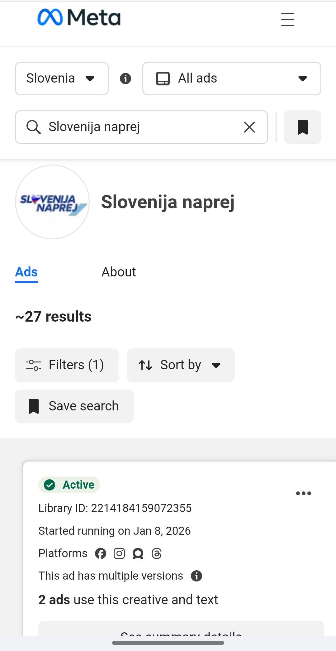 Na Meti kot rečeno stranke nimajo več oglasov. Ima pa 27 oglasov aktivnih profil Slovenija Naprej. Svoboda torej neposredno krši Metina pravila, pa še uredbo EU.