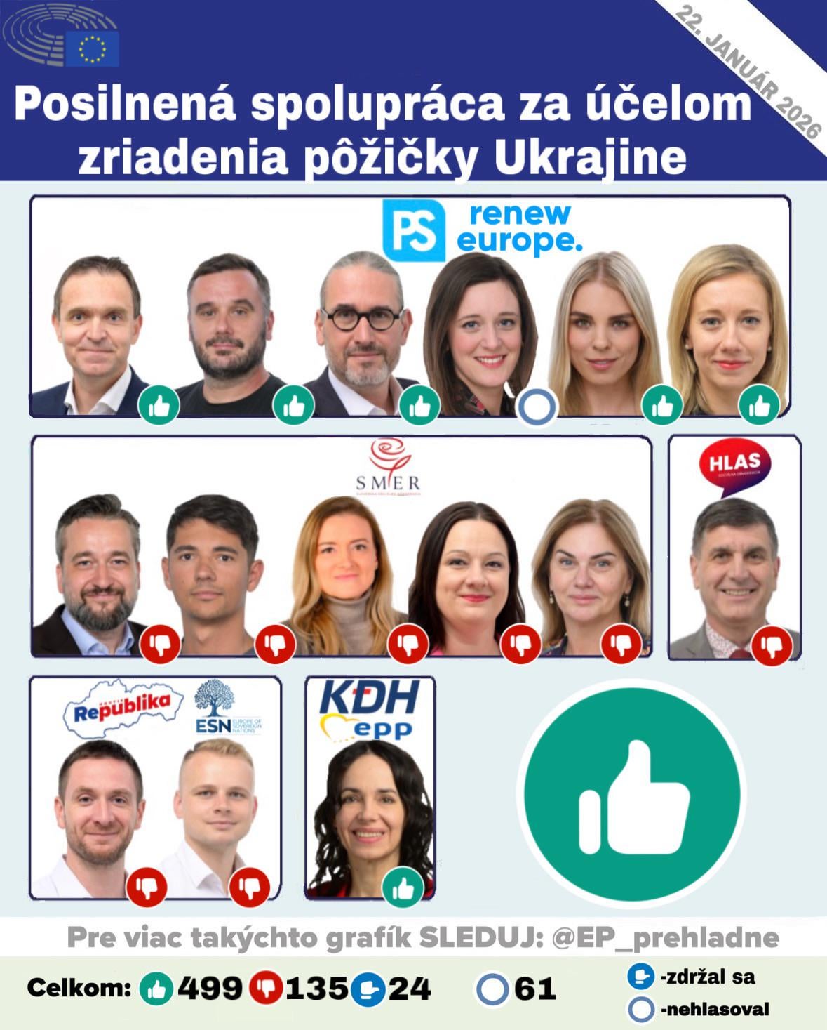 Európsky parlament dnes schválil kľúčové rozhodnutie, ktoré umožňuje posilnenú spoluprácu medzi 24 členskými štátmi EÚ pri vytvorení finančného nástroja, a teda pôžičky pre Ukrajinu vo výške až 90 miliárd eur na roky 2026-2027. Do tejto iniciatívy sa Slovensko nepripojilo.