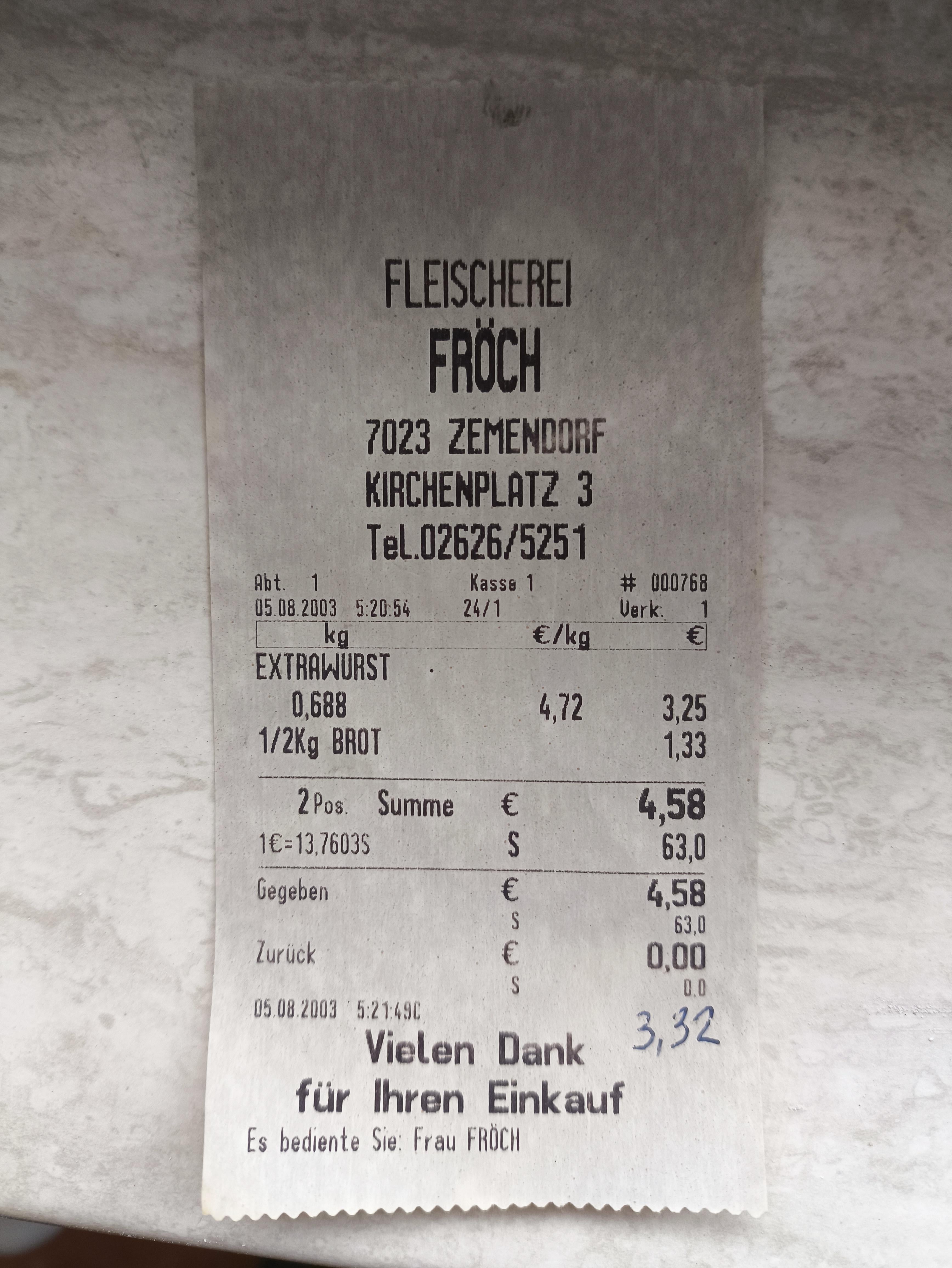 Beim Umbau eine Rechnung von einem Fleischhauer aus 2003 gefunden. Hab leider keinen direkten Vergleich vom Fröch aber beim Spar kostet die Extra heute 15,90/kg und beim Billa sogar 21,90/kg. Wenn ich rein meinen Kollektiv betrachte hat sich das Gehalt seit 2003 beinahe verdoppelt – Brutto versteht sich – während sich Wurst mehr als verdreifacht hat.