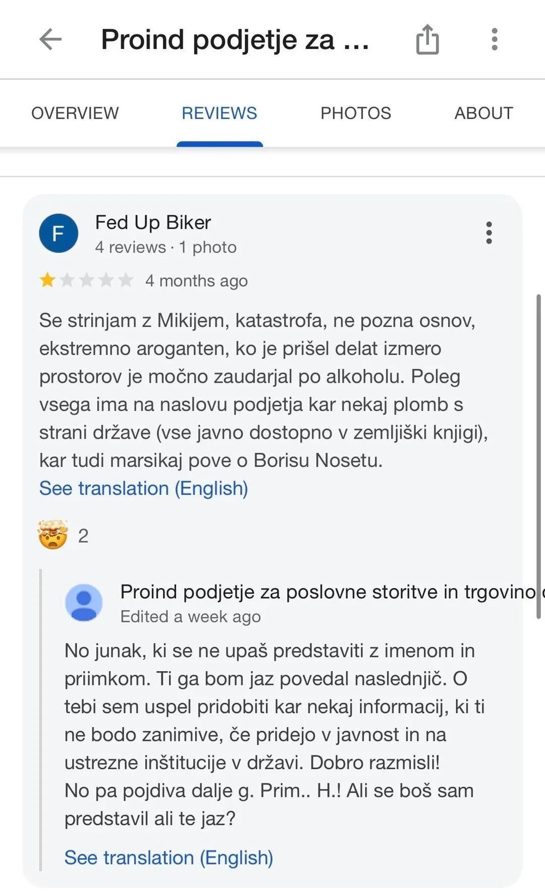 Ampak čez nekaj mesecev me kliče pijan ko opica, glede negativne ocene na google reviews. Trdil je, da sem to oceno napisal jaz, čeprav je nisem. Bolj ko sem mu skušal dopovedati, da nimam nič s tem in mi dol visi za njega in vse skupaj, bolj je težil, da naj zbrišem oceno, če ne se bo oglasil pri meni doma. Ko sem prekinil me je neprestano klical še parkrat, dokler nisem blokiral cifre, potem me je klical še nekaj dni z različnih cifer, katere sem vse blokiral, in očitno mu jih je končno zmanjkalo. Nekaj tednov po tem sem prejel dopis s strani odvetniške pisarne, da naj oceno izbrišem, v nasprotnem primeru bodo šli v tožbo zoper mene za blatenje in laganje.