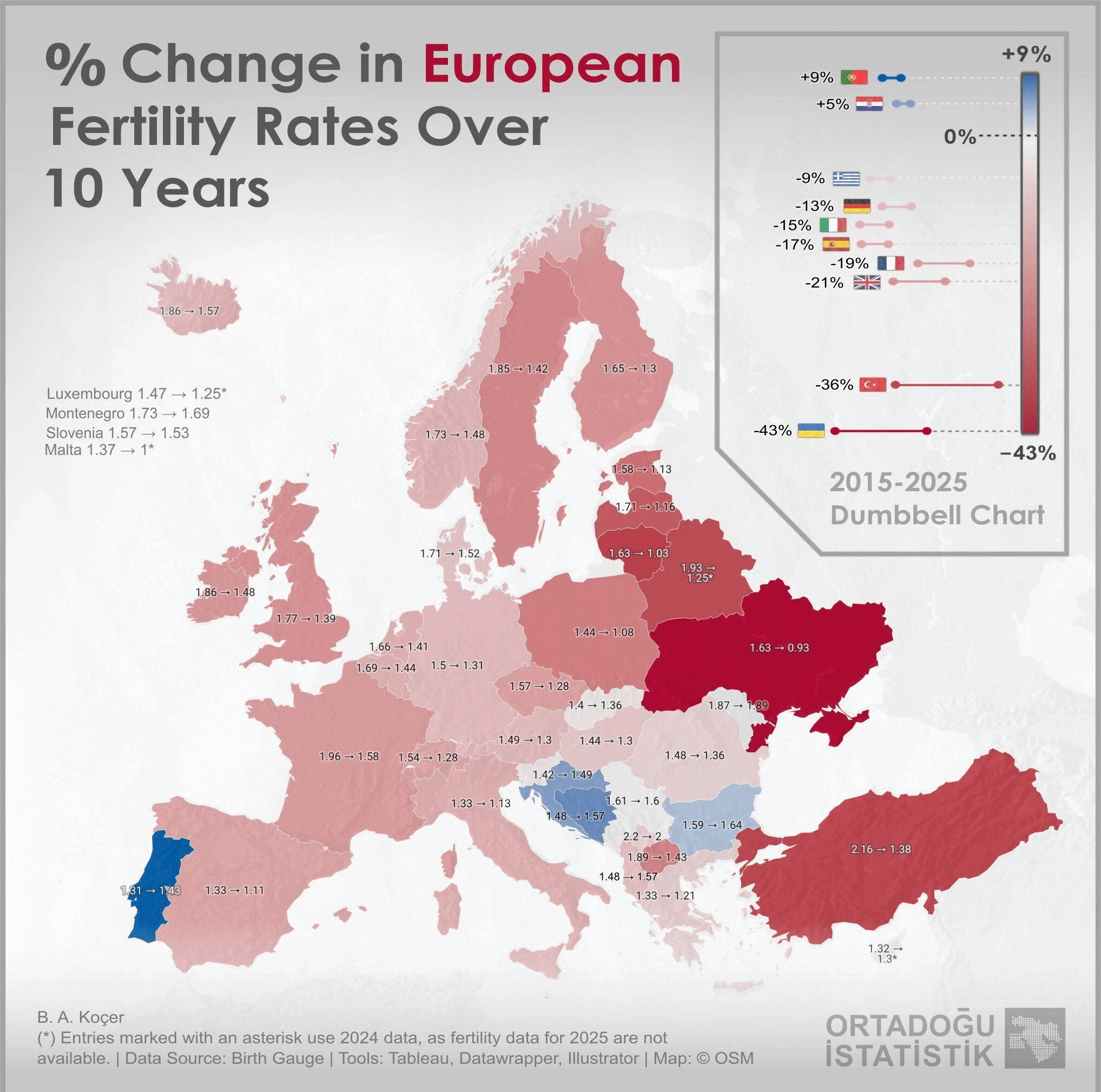 Change in European Fertility rates over the last 10 years — TommyPpb3 Tags:Portugal 2 comments Entre 2014-24 está igual https://www.pordata.pt/pt/estatisticas/populacao/nascimentos-e-fecundidade/taxa-bruta-de-natalidade-0 O poder das Brasileiras, já diziam as mães de Bragança Leave a ReplyYou must be logged in to post a comment.