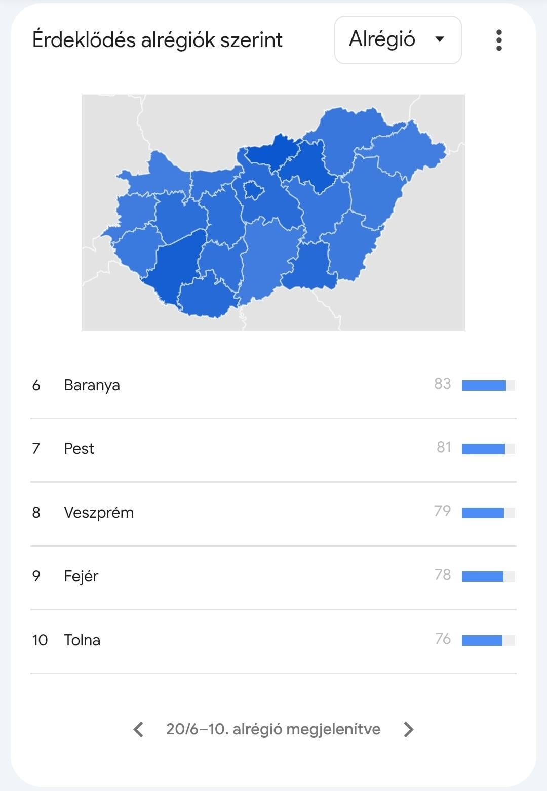 Ami szerintem a legfontosabb tanulság, az a területi eloszlás (3. kép). Ha megnézitek a listát, az érdeklődés intenzitása (ahol a 100-as érték a maximumot jelenti az adott régió népességéhez képest) így néz ki: