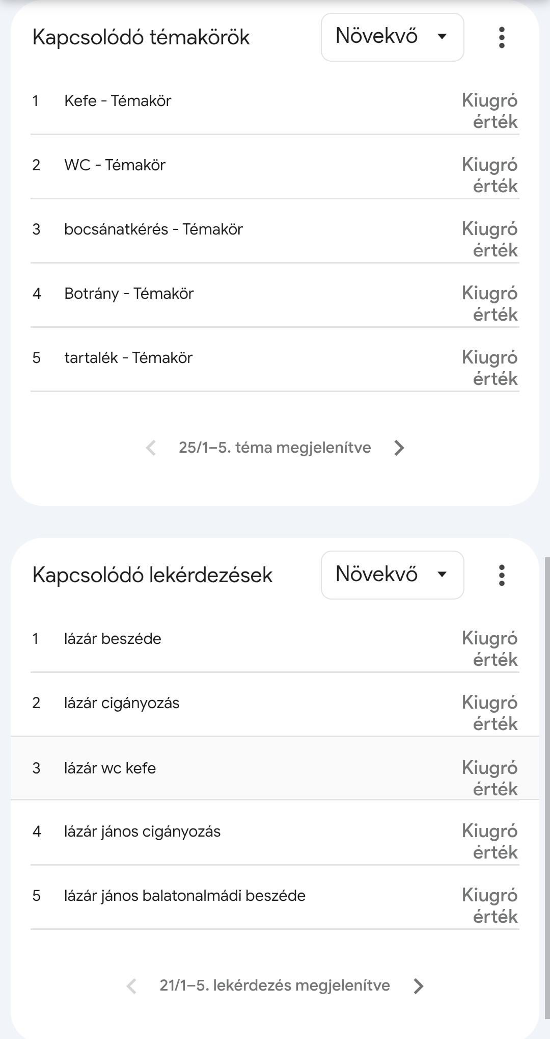 A kapcsolódó lekérdezések (4. kép) között ott figyel a „kefe”, a „WC”, a „lázár cigányozás” és a „bocsánatkérés”. Ez a narratíva ívét mutatja be: a sértő kijelentéstől a Momentum vécékefés akcióján át egészen a kaposvári bocsánatkérésig. Érdekes, hogy Somogy megye is ott van az élmezőnyben (93-as index) – valószínűleg azért, mert Lázár Kaposváron próbálta eloltani a tüzet a híres-neves DPK bocsánatkérésével.