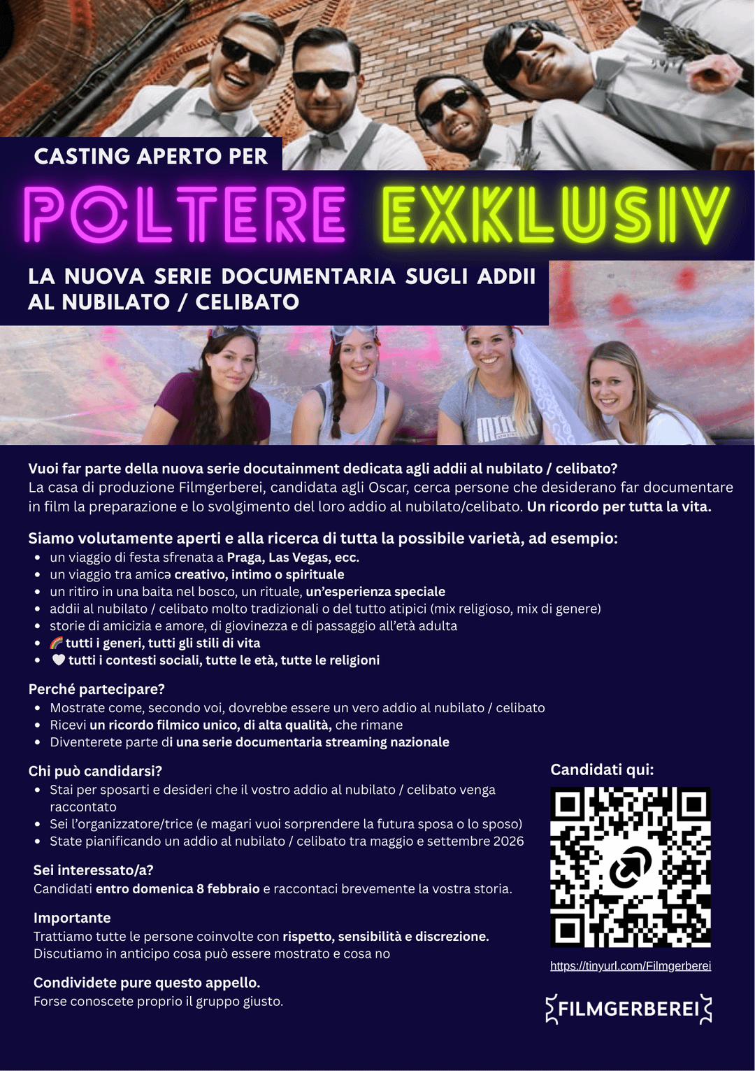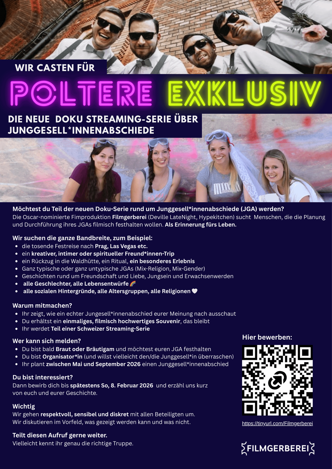 I work at a filmproduction named Filmgerberei (SRF DevilleLateNight, Hypekitchen, Oscar-nominated) and we are developing a docutainment-series for a Swiss streaming platform. It is about the so called "Junggesell*innen-Abschiede / Enterrement de vie de celibataire / addii al nubilato/celibato", the bachelor trips!