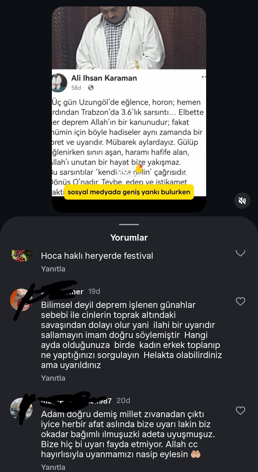 Uzungöl’de düzenlenen horon festivalinin ardından Trabzon’da bir deprem meydana geldi. Depremin sonrasında bir imam, sosyal medyada “Sınırı aşan Allah’ı unutan, eğlence ve horonlu bir hayat bize yakışmaz” diyerek festivali hedef alan bir paylaşım yaptı ve paylaşımı inanılmaz destek topladı.