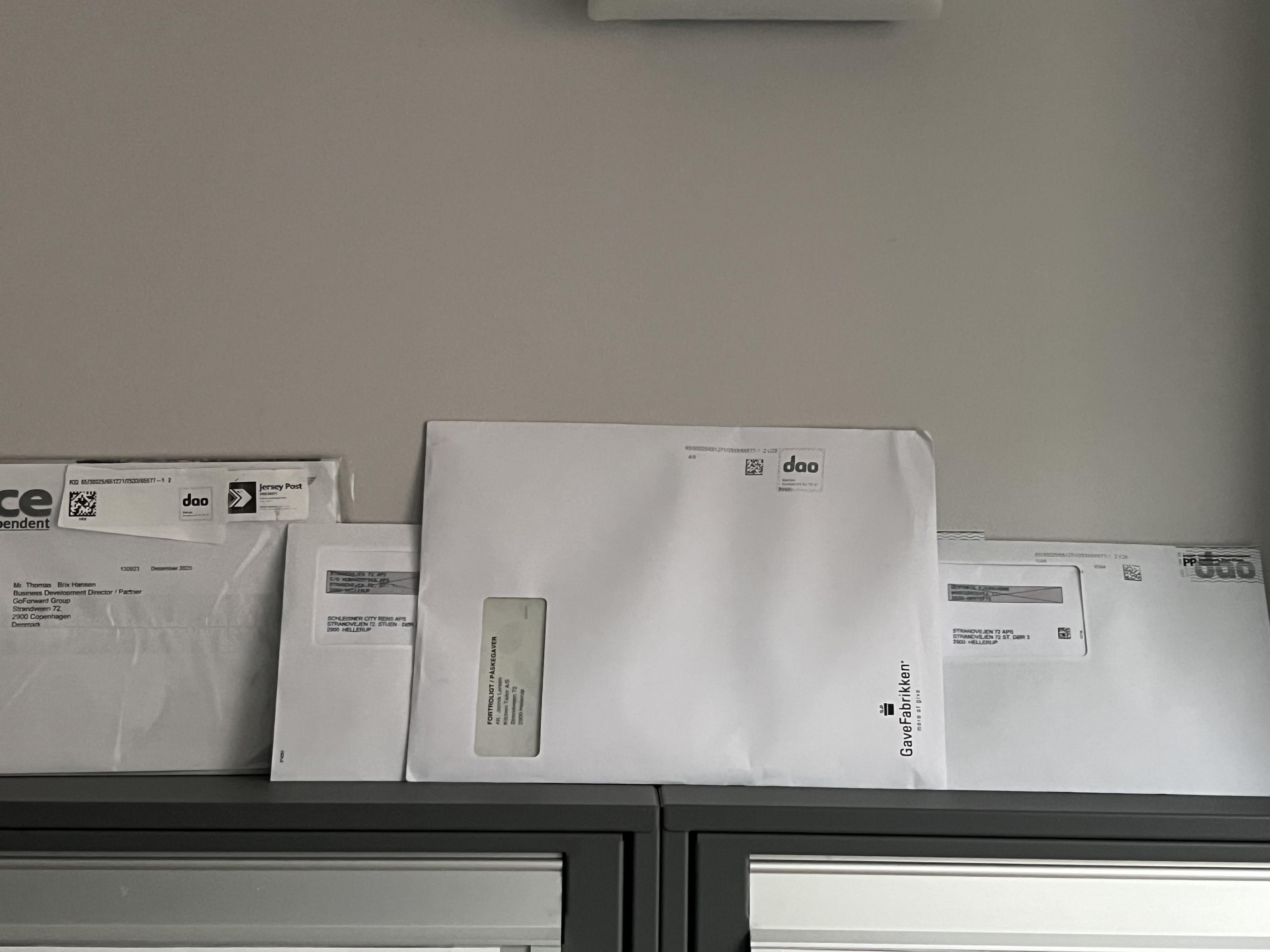 5. Da vi kom tilbage på arbejde efter nytår og checkede postkassen for første gang var der 3 breve leveret forkert af dao. 2 var til andre virksomheder der har lejemål i vores bygning, så det var hvad det nu var, men det 3 var dælme en virksomhed der havde adresse 300 meter væk, på en helt anden gade.