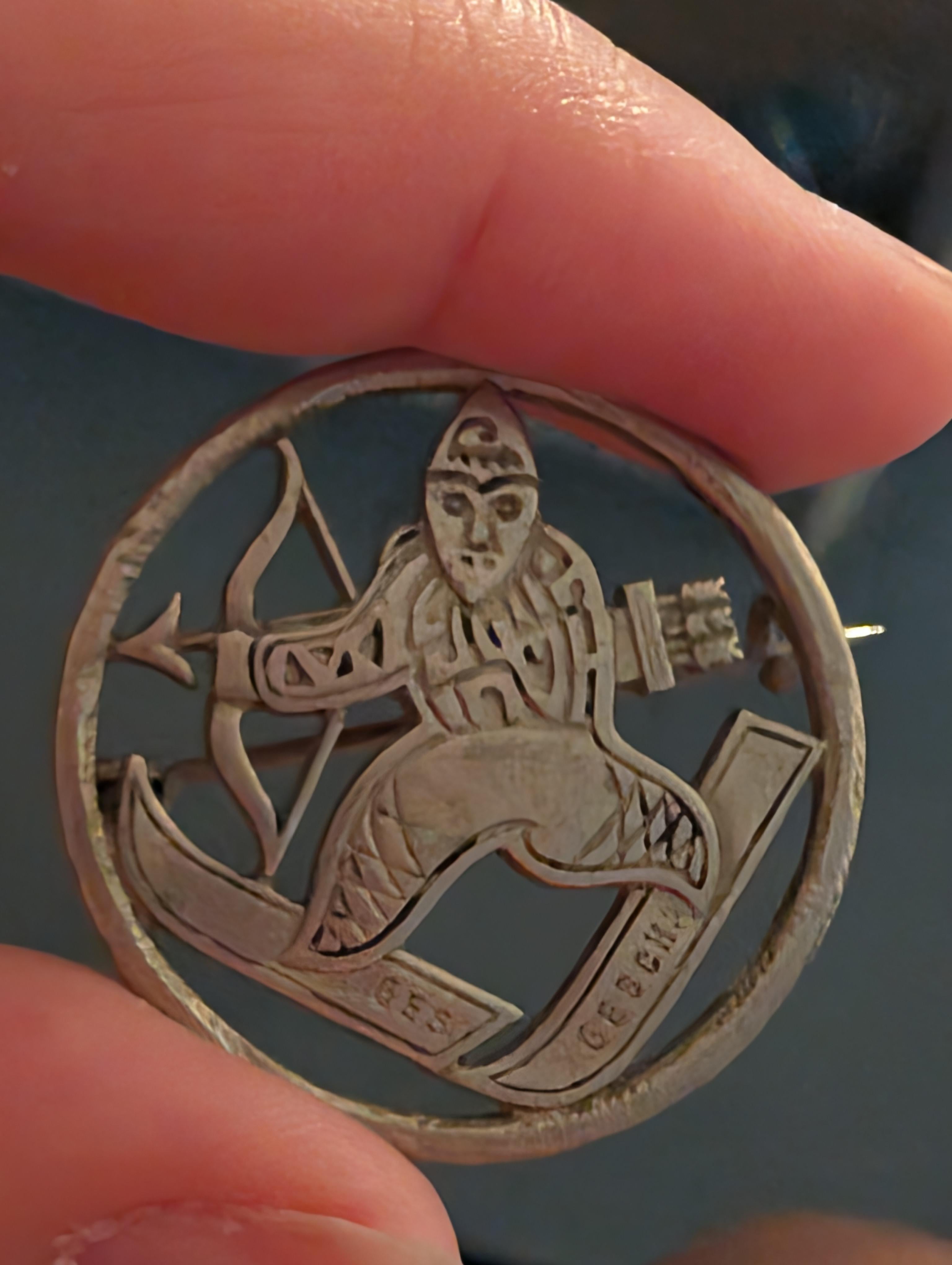 I bought this years ago at a antique stall in London. I looked up "Ges Gesch" which the internet tells me is short for a German phrase Ges. Gesch." is an abbreviation for the German phrase "gesetzlich geschützt," which translates to "legally protected" or "registered" in English. It indicates that a product, design, or trademark is officially registered and legally protected under German law. But I would love to know more about this pin. Love any help or suggestions on how identifying where this pin came from and what it represents
