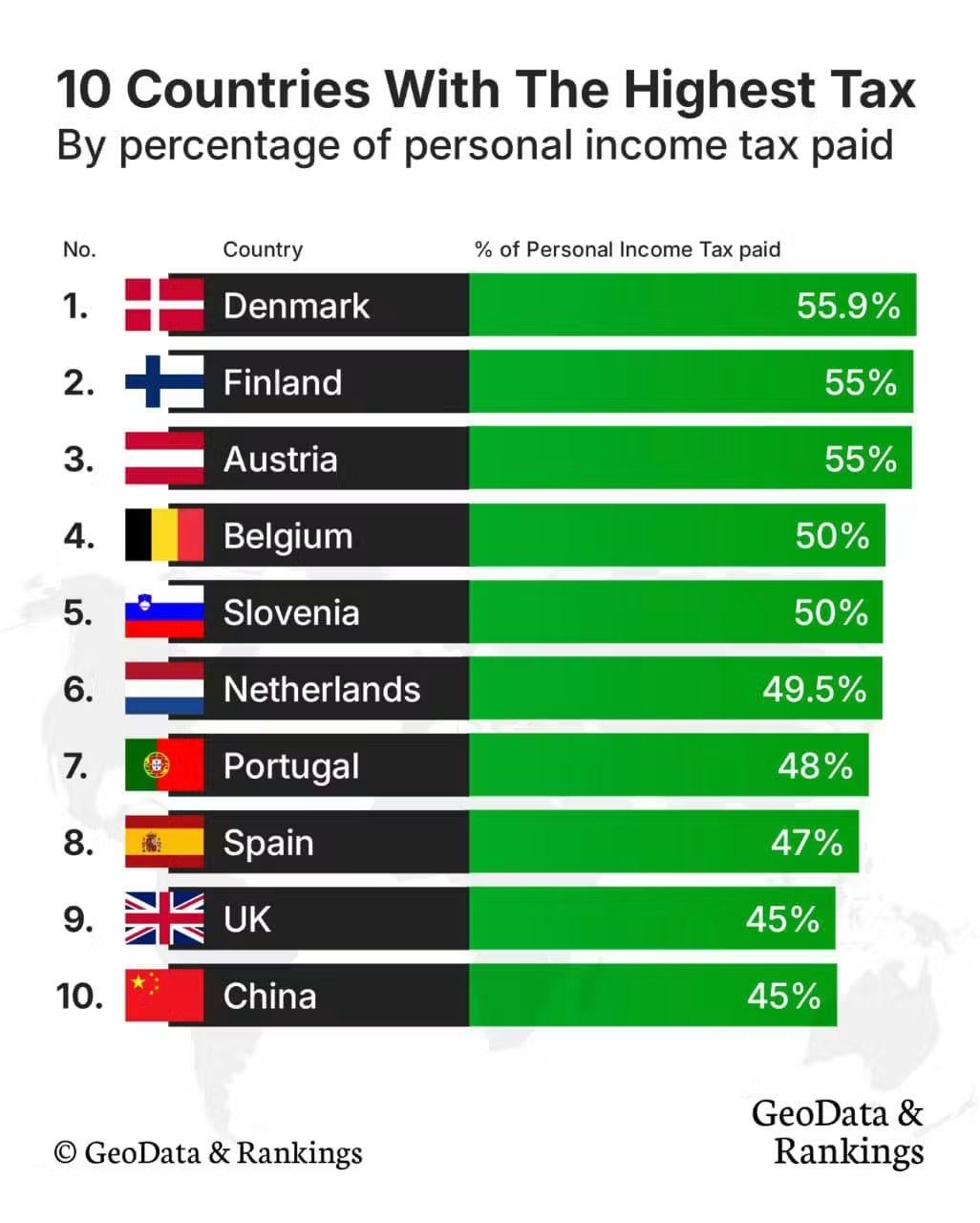 Vorsicht: 55 % ist die höchste Steuerstufe. Der Durchschnittssteuersatz ist deutlich niedriger, ca. 45 % inklusive SV-Beiträge. Vermutlich ist das in anderen Ländern ähnlich, da alle ein Stufentarifsystem haben.