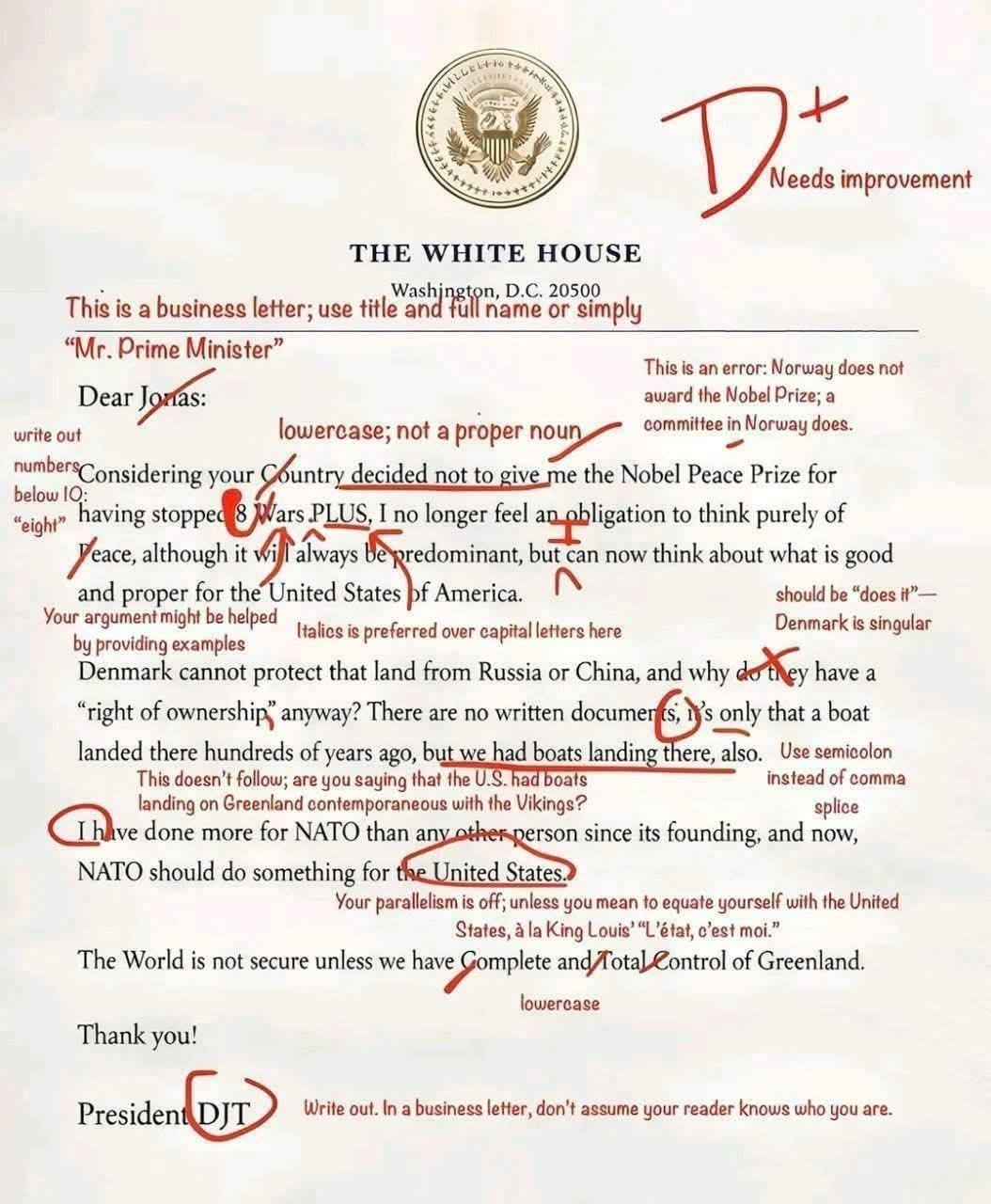 This was a text message Trump sent to the Norwegian PM, someone unknown made it into a «letter» for effect, then someone else humorously «corrected» it.