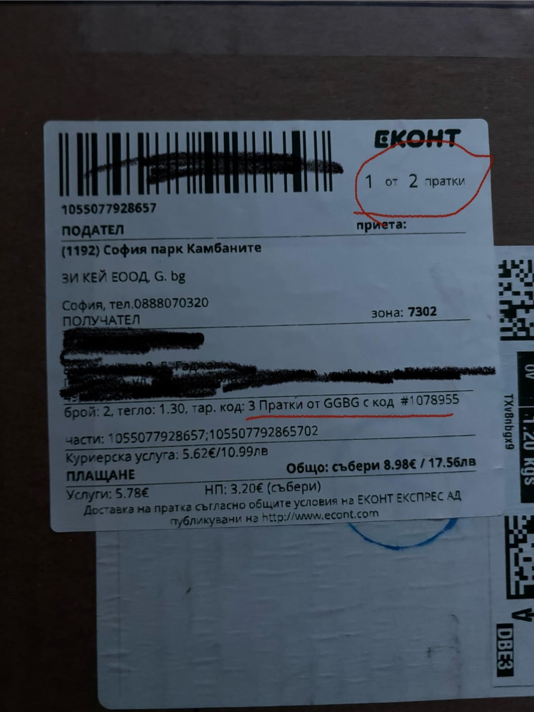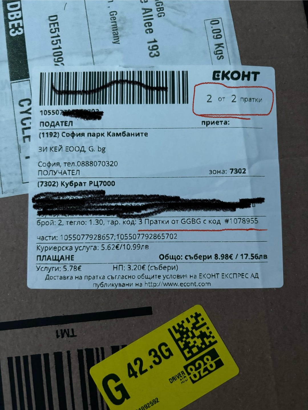 Вчера получих 2 пратки, а трябваше да са 3. Проверих, за да се уверя, че не греша, и установих, че при доставката въпросната служителка на GGBG в Германия (Kostova) е подписала за 3 пратки (ще прикача снимки отдолу). В сайта на GGBG обаче имам регистрирани само 2 от 3 пратки, докато в самия лейбъл на Еконт има 3 пратки на мое име със същия курс (снимки отдолу).