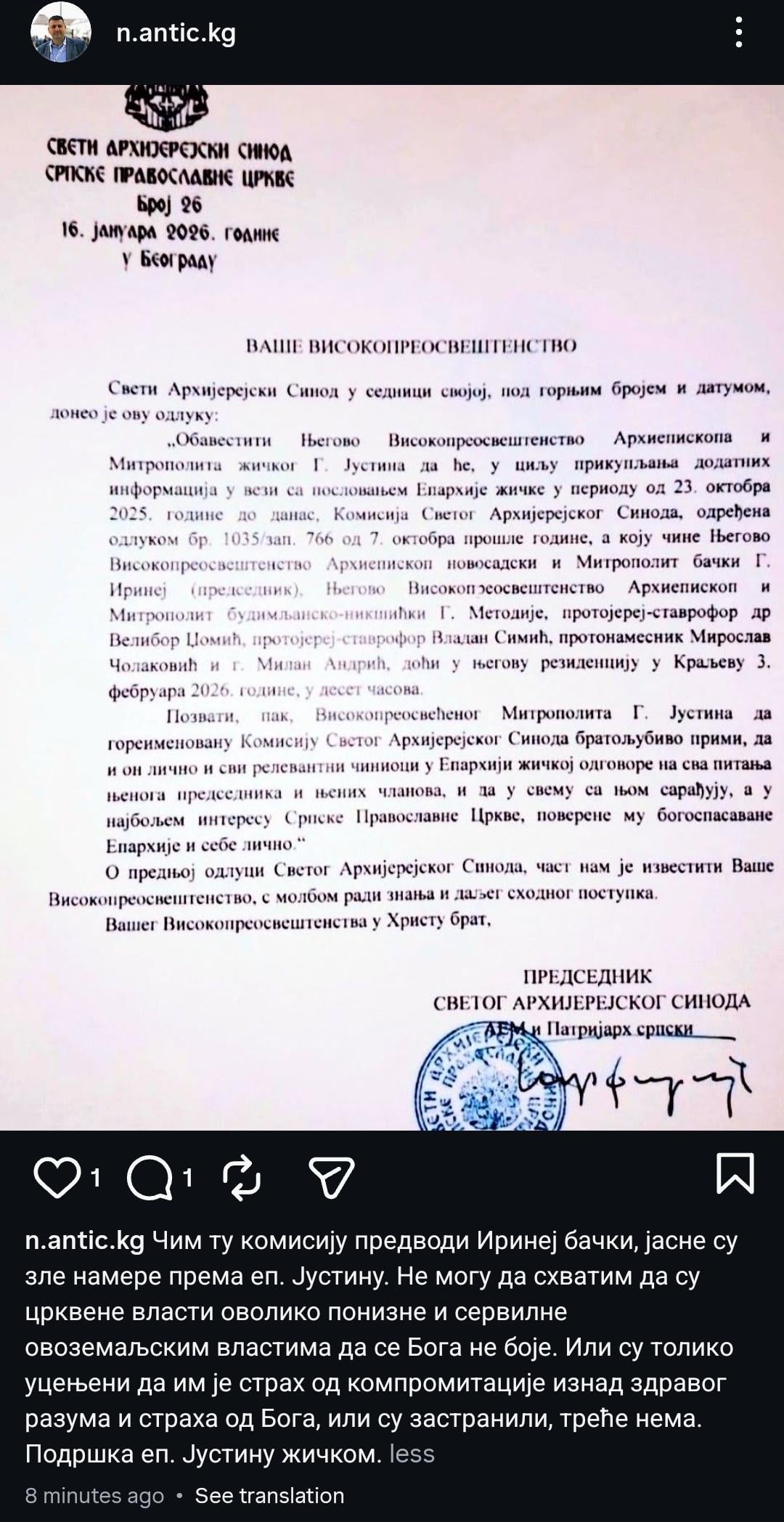 Подршка еп. Јустину жичком