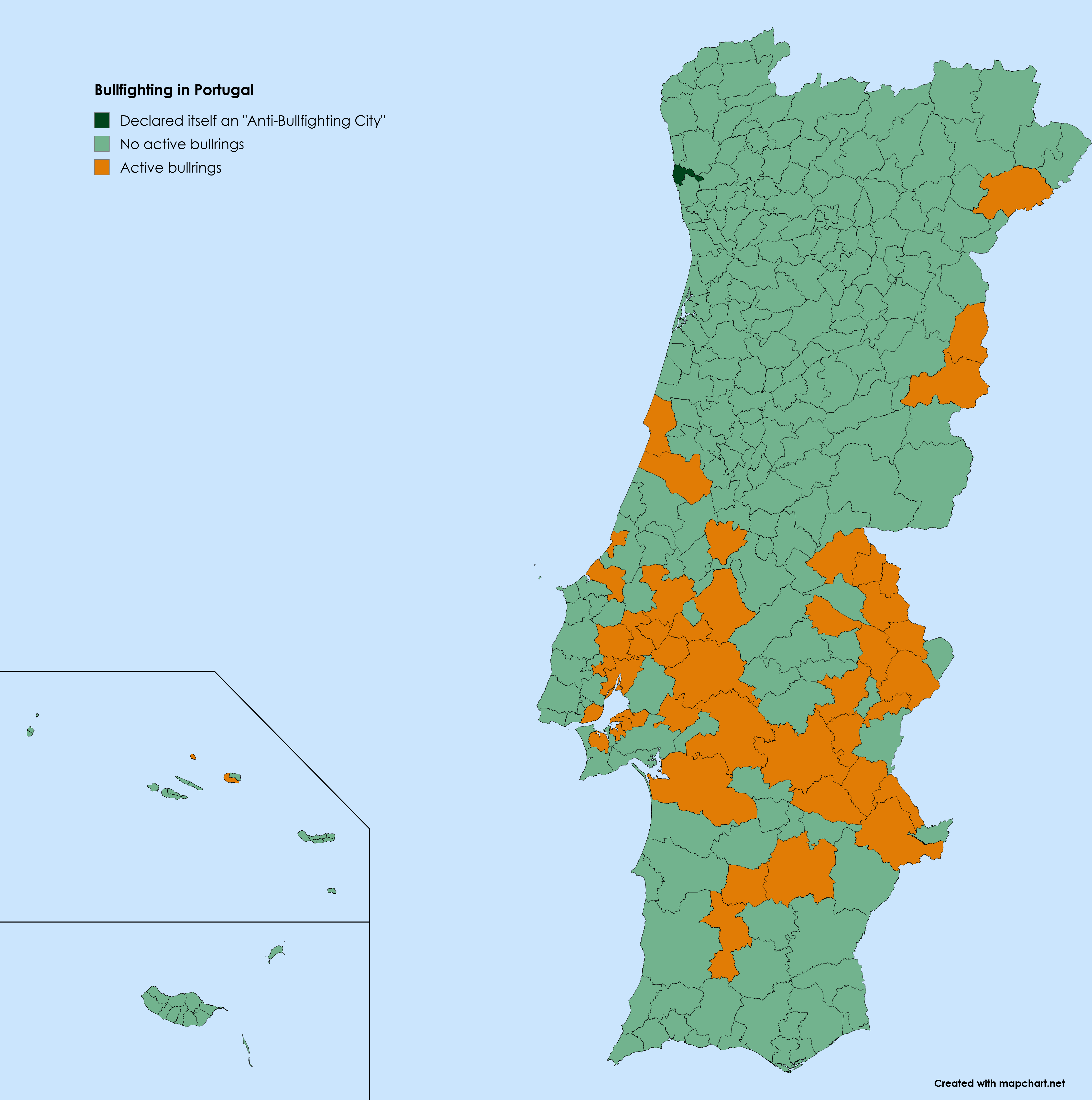 Not surprised Alentejo and Ribatejo are so orange. Those are the big bullfighting regions in the country. But Alentejo is the least populous region in the country, anyway.