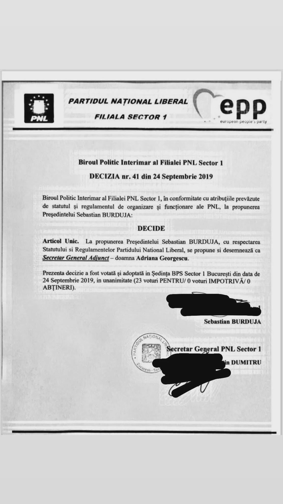 Decizia prin care avocata PNL prinsă că lua șpagă devenea secretar general adjunct al filialei Sector 1, condusă de Sebastian Burduja