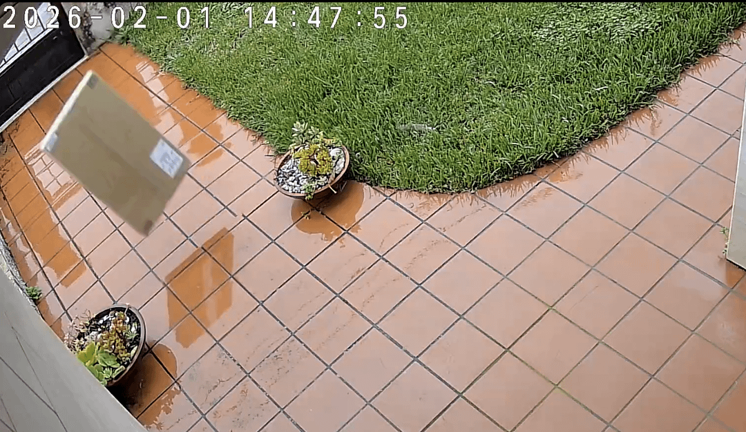 O estafeta teve o cuidado de tirar uma foto da caixa em bom estado antes de a atirar como se tratasse de uma bola de basquete. Provavelmente para se esquivar de qualquer responsabilidade.