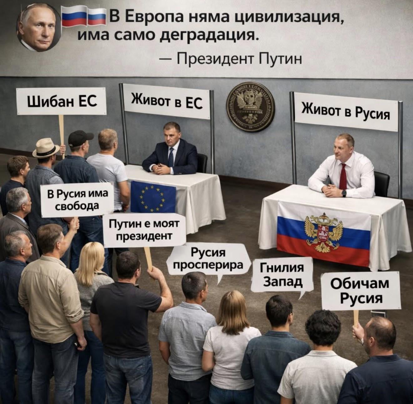 Това няма общо с лицемерието и това е проблема. Тези хора на изборите гласуват по същия начин. Има много причини да се самоопределиш така… Някой са недоволни от живота счи си търсят причината в системата не в тях, други си търсят кауза а трети просто са си расисти и ненавиждат всичко различно. Това е одеята на руската пропаганда, тя се промени и модерната версия вече идеята е да вкараш съмнение и несигурност. На всеки от тез идиоти им е ясно че в Русия е по-гадно за това те оскат Руски вариант за ЕС в който си мислят че ще са по-добре… и въобще не разбират ще Руския вариант идва с Руската реалност, мафия, олигархия и мизерия.
