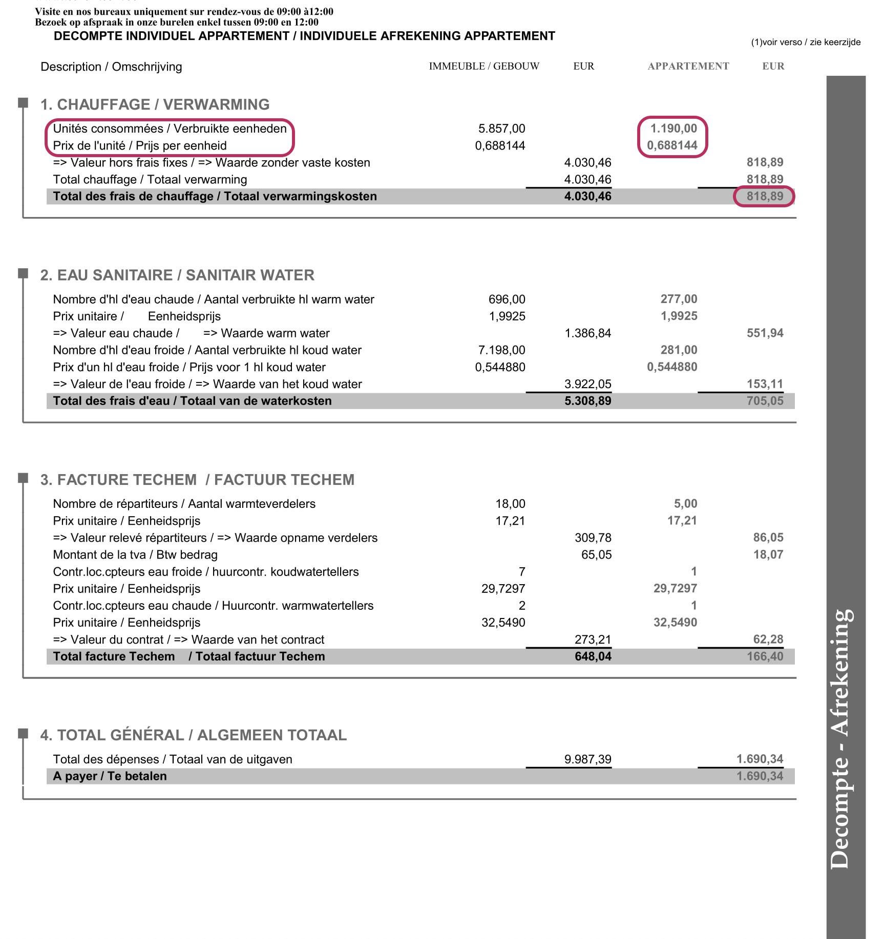 I’ve just received my latest Techem heating bill for an apartment in Belgium (Kraainem), and the total feels very high to me. I’d like to get some feedback, especially regarding the price per unit (calorimeter / heat cost allocator) and the overall logic of the calculation.