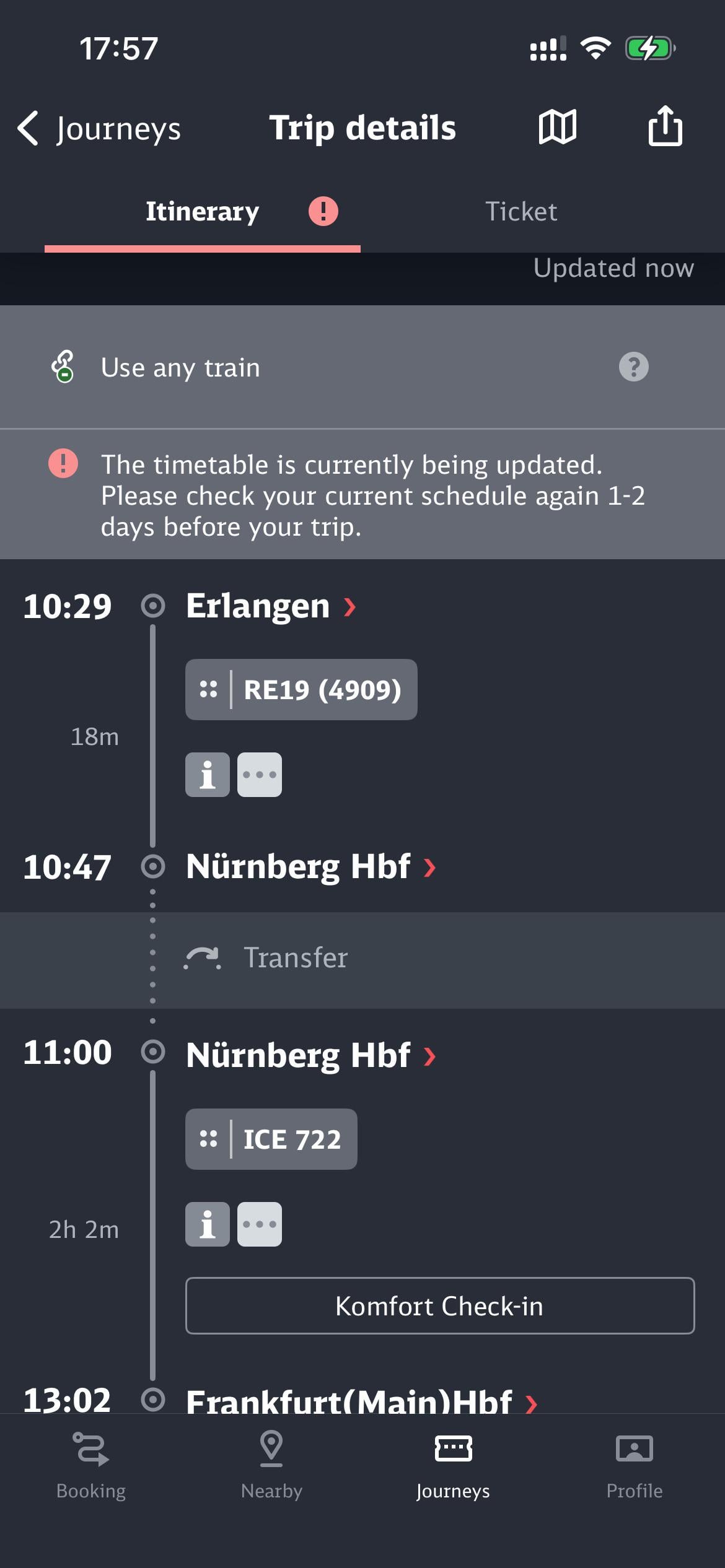 I have a ticket that shows “Use any train” for this journey (regional + ICE). My trip is scheduled for Wednesday, and at the moment none of the trains in my connection show delays or cancellations on this page