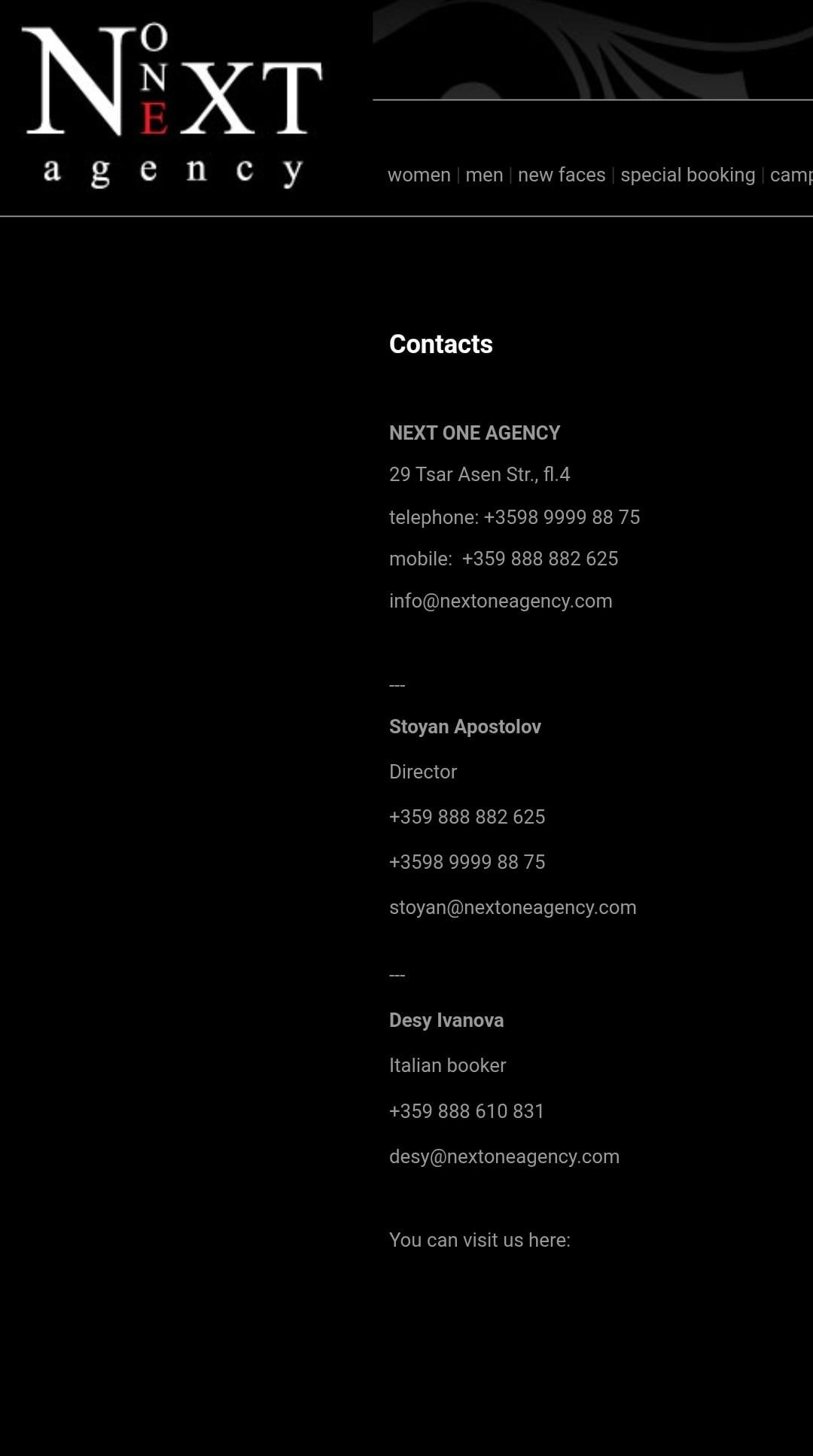 Next One Agency is established in the beginning of 2008 by Stoyan Apostolov, who has a long-term experience in the model business. Thanks to our bookers’ hard and diligent work the agency has positioned itself among the leading ones at the Bulgarian market. Read more…