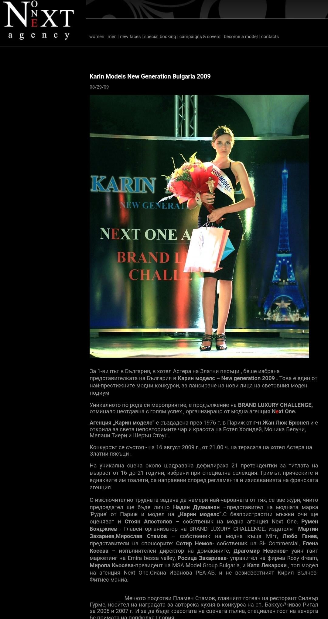 За 1-ви път в България, в хотел Астера на Златни пясъци , беше избрана представителката на България в Карин моделс – New generation 2009 . Това е един от най-престижните модни конкурси, за лансиране на нови лица на световния моден подиум