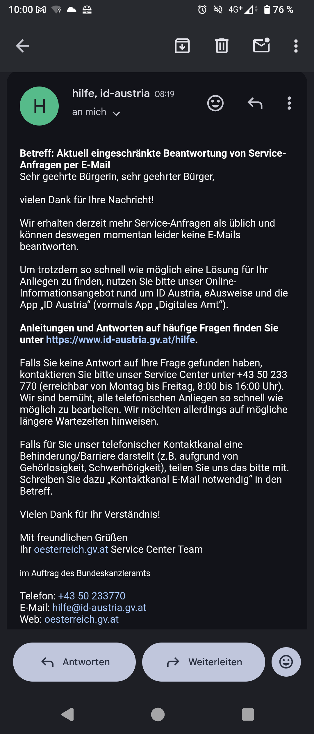 Um trotzdem so schnell wie möglich eine Lösung für Ihr Anliegen zu finden, nutzen Sie bitte unser Online-Informationsangebot rund um ID Austria, eAusweise und die App „ID Austria“ (vormals App „Digitales Amt“"