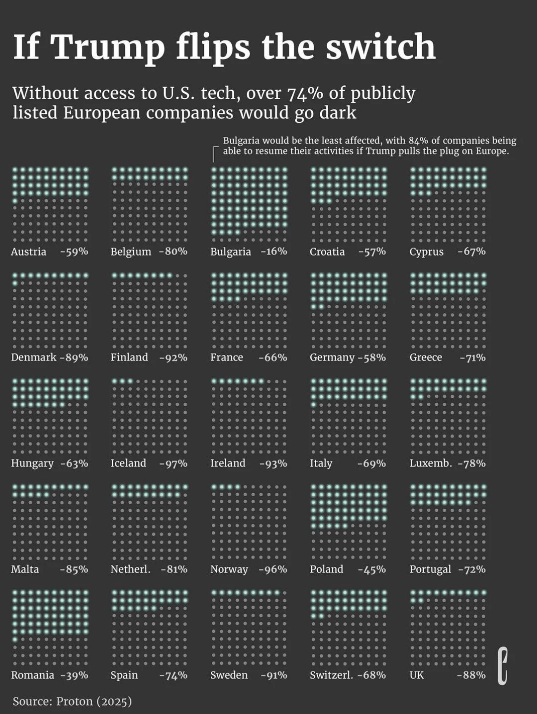 > Proton analyzed business email domains across Europe to show how many publicly listed companies are reliant on US email and email security services. We looked at email because it’s often the gateway to a company’s tech stack. When a company chooses an email service, it often uses the entire suite.