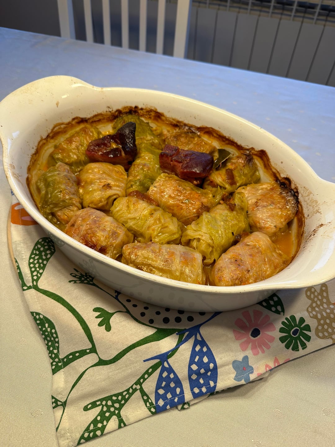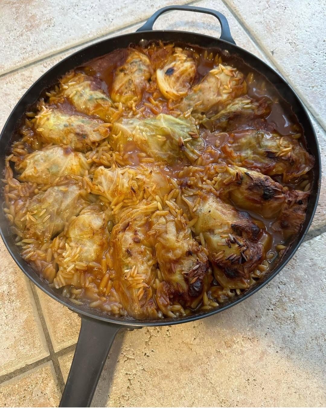 We made the filling with minced meat, some rice, and chorizo sausages. I tried shopping for the cured hams(?) that I saw Serbians eat, but I didn't know which ones to buy and the cured meats selection at Maxi was just too big. I really want to try the cured meats but don't know where to get started. Anyway, we rolled it up in cabbage leaves. I know its supposed to be fermented, but we just steamed it in hot water as we didn't know how to ferment it. I bought packaged Sarma sauce powder from Maxi, threw in some orzo pasta I had in my kitchen, and roasted it in the oven.
