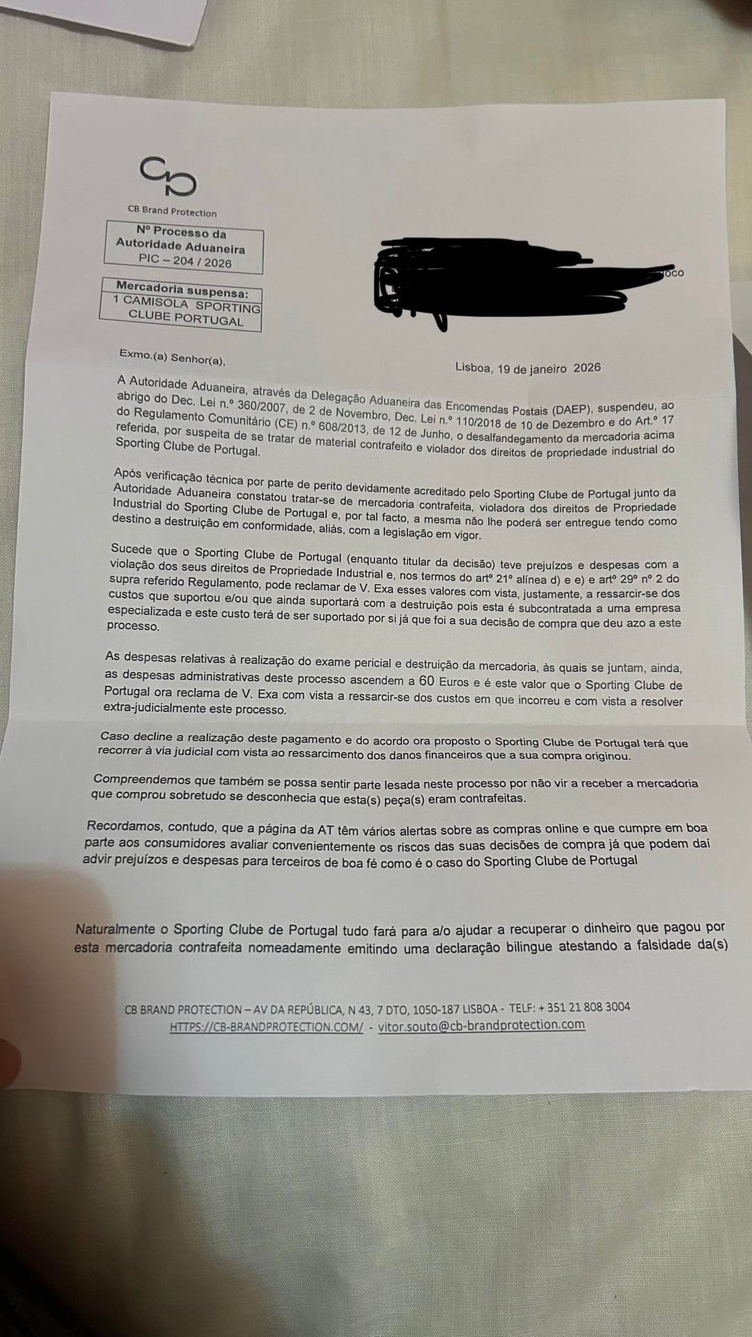 Mandei vir umas camisolas da mister tuga em novembro e até hoje elas não chegaram, ficaram presas na alfândega. Hoje recebi esta carta do Sporting clube de Portugal a reclamar 60€ de multa porque encomendei uma camisola deles contrafeita e outra carta da Kappa a reclamar 85€ pelo mesmo motivo. Já alguma vez receberam isto? É burla?