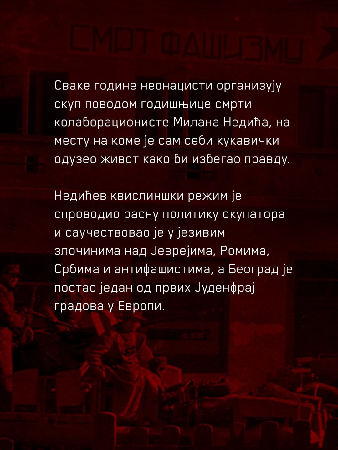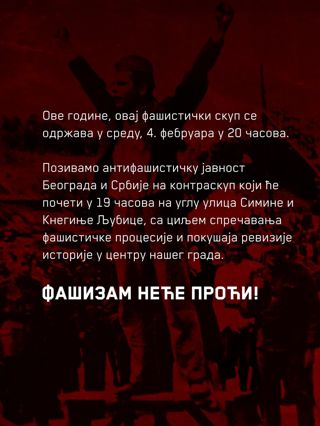 U sredu, 4. februara, u 19 časova, na uglu ulica Simine i Kneginje Ljubice u Beogradu biće održan antifašistički kontraskup povodom obeležavanja godišnjice smrti Milana Nedića, poznatog kolaboracioniste tokom okupacije u Drugom svetskom ratu