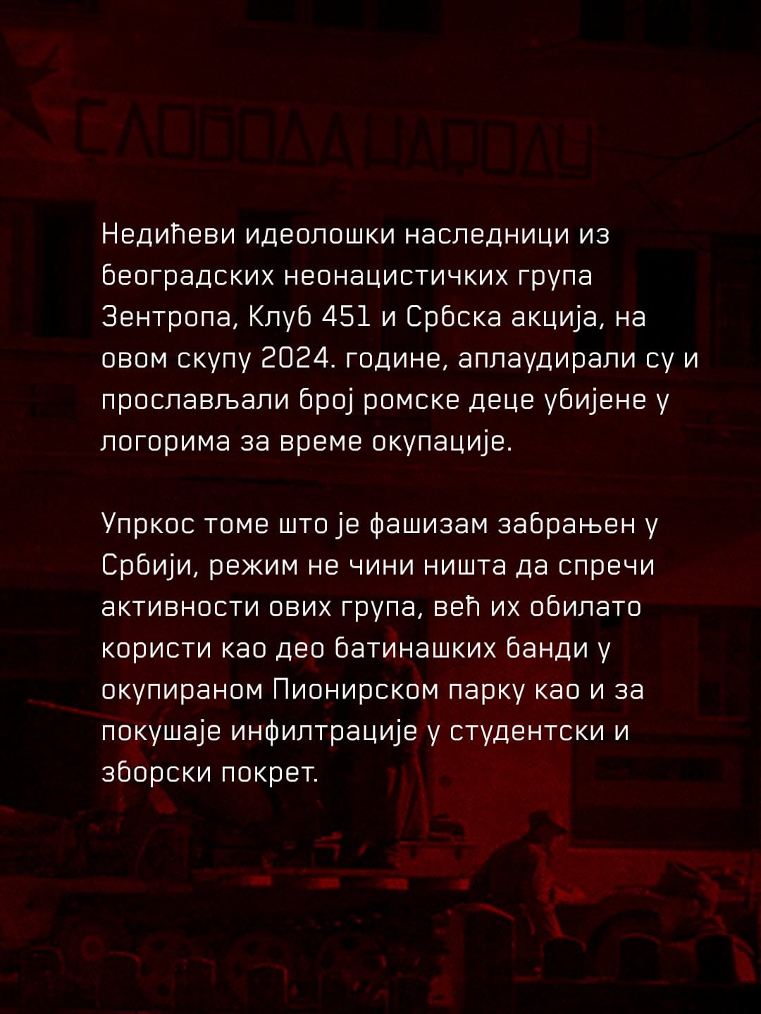 Na uglu Simine i Knjeginje Ljubice? Pretrgli su se, pa po hleb u pekaru idu dalje. Salonski antifašisti organizuju protest protiv nacoša direkt ispod salonaca koje su im dede “oslobodile” 1945. Samo se spuste niz stepenice, mogu i u šlafroku i bade mantilu na protest, ne moraju da se presvlače.