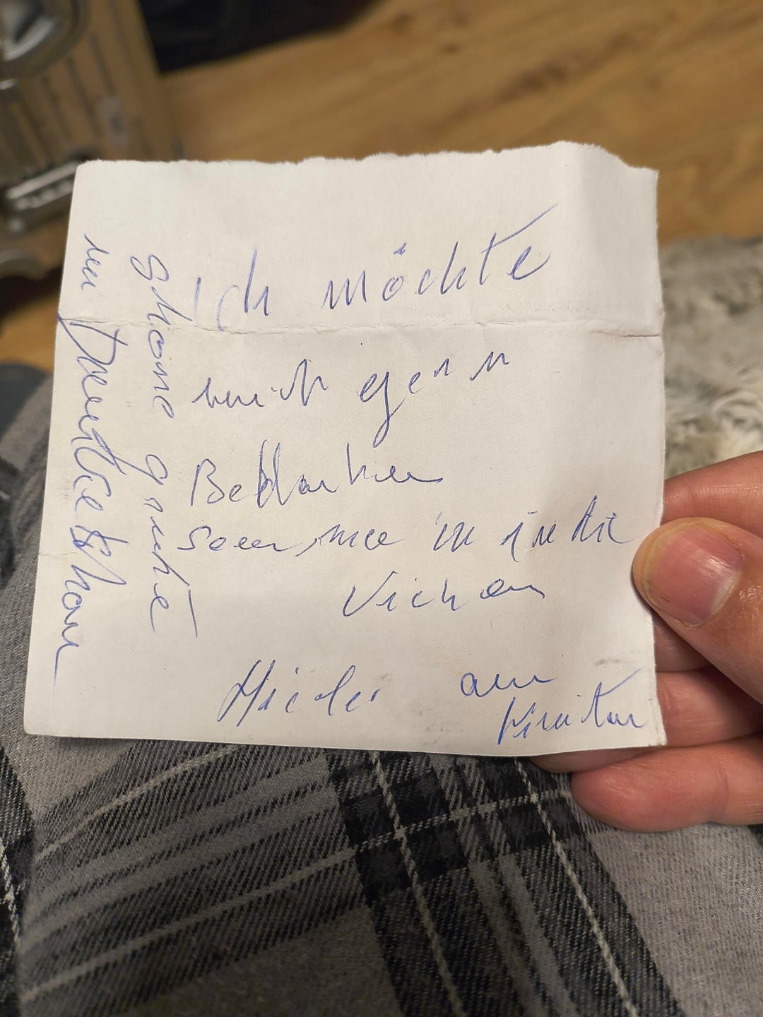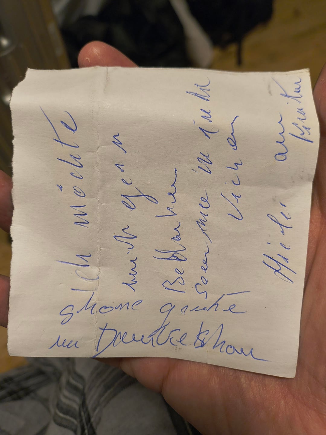 Parts of this note are unreadable. Do you have a very old person or a person suffering from dementia in your house? I could be mistaken but the writing style changes from trying to write very clearly to really weird. Also the Ms the g seem to be written in an old fashioned style and the CH in “möchte” is written in modern style but in the line below they switch to cursive. I wonder if the unreadable lines could even have elements of kurrent. I think the older generation still learned that at school and if is dementia this memory might be older and less corrupted than modern style handwriting. You could ask in r/Kurrent if it is more readable to them.