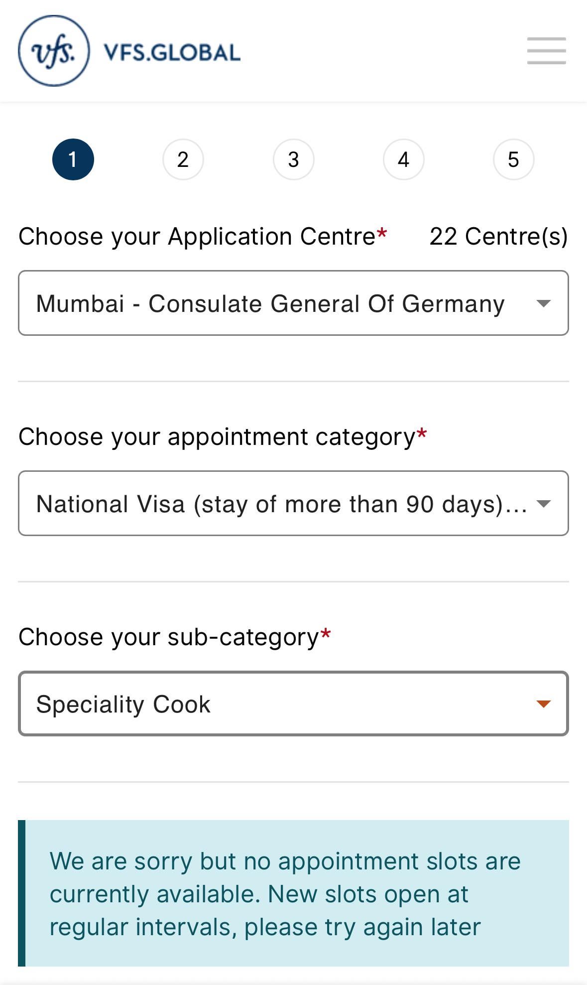 I’ve been checking the VFS Global – Mumbai (Consulate General of Germany) portal for a National Visa (Speciality Cook) appointment for a few months now.