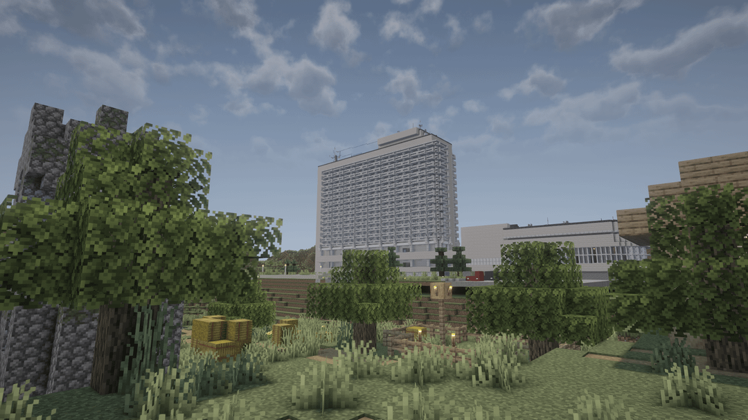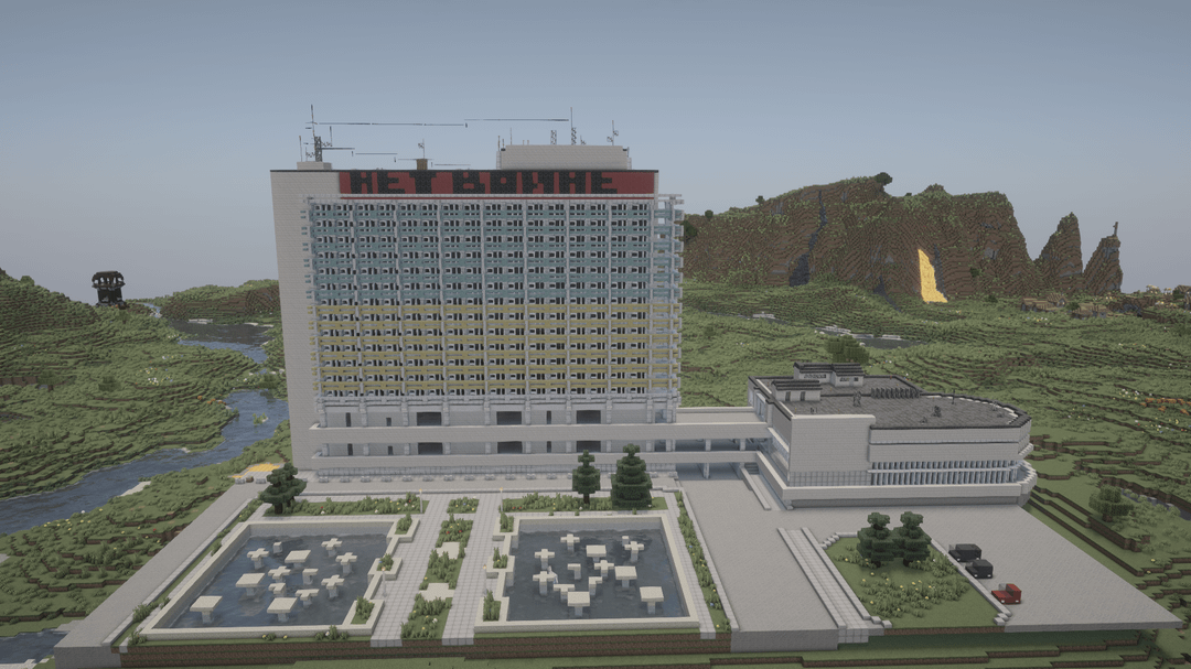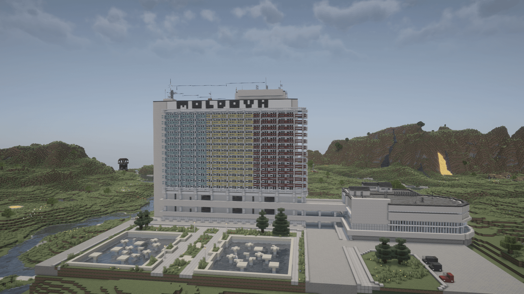 Are cam 70 blocuri inaltime si include intreg hotelul, restaurantul si parculetul din fata cu fantani. L-am construit fara toate gunoaiele, narcomanii si distrugerile din prezent, mai apropiat de starea in care a fost initial, dar am adaugat si fatadele din 2022 in care blocul a fost vopsit in stil ucrainean si dupa in stil moldovenesc.