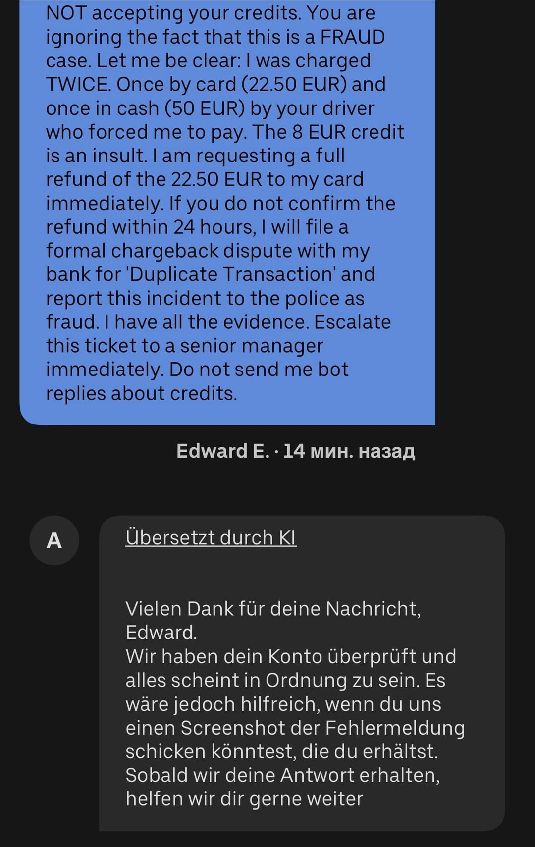 Has anyone experienced this "Cash + Card" double dipping with the Uber Taxi option in Germany? Is the only solution a bank chargeback (Lastschrift-Widerruf)? I'm worried Uber will ban my account, but I refuse to let them steal €22.50 on top of the €50 I already paid.