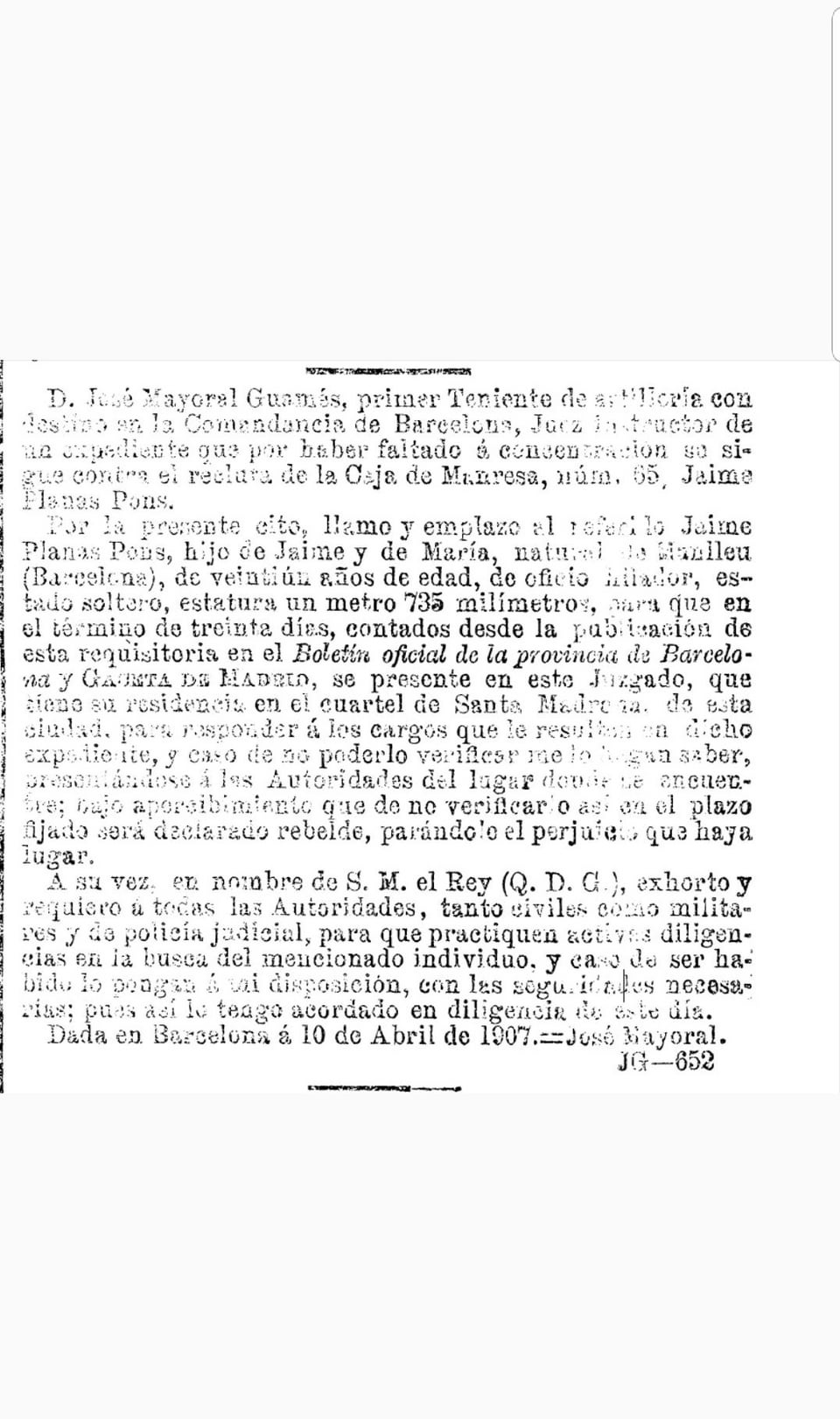 Mi bisabuela disfrutaba mucho de contar la historia de sus padres, y la relataba siempre que podía: ambos eran catalanes de Manlleu y anarquistas, a juzgar por las marchas que cantaban. Cuando su padre fue convocado a servir al rey en Marruecos, en 1907, la madre, desilusionada, dijo que no lo esperaría.