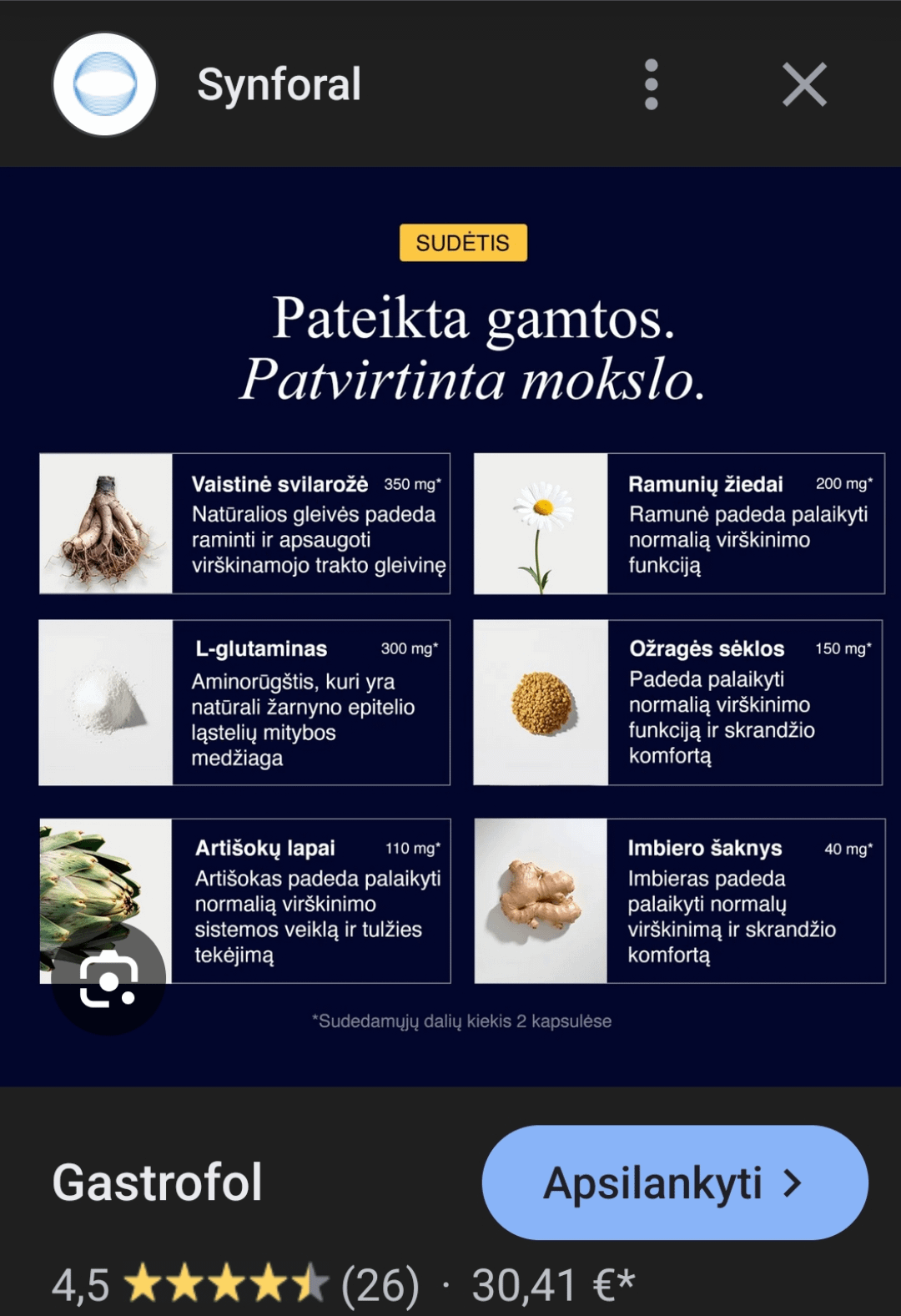 Sveiki, gal kas bandėtė šiuos papildus kurie neva padeda nuo skrandžio refliukso? Gana brangūs, įdomu ar veiksmingi? Vadinasi SYNFORAL GASTROFOL. Pridedu sceenshota su sudėtim iš jų puslapio. Kaina 30€ mėnesiui.