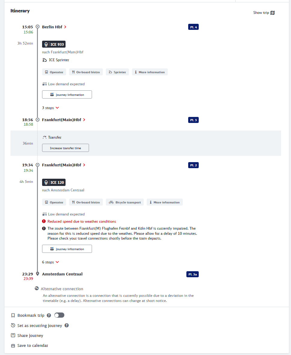 4. It says “Alternative connection” because Berlin – Frankfurt – Amsterdam isn’t normally a recommended or allowed route for normal Berlin – Amsterdam direct tickets. *But it is allowed today* because the direct Berlin – Amsterdam trains are cancelled and the straight route through Hannover is completely closed