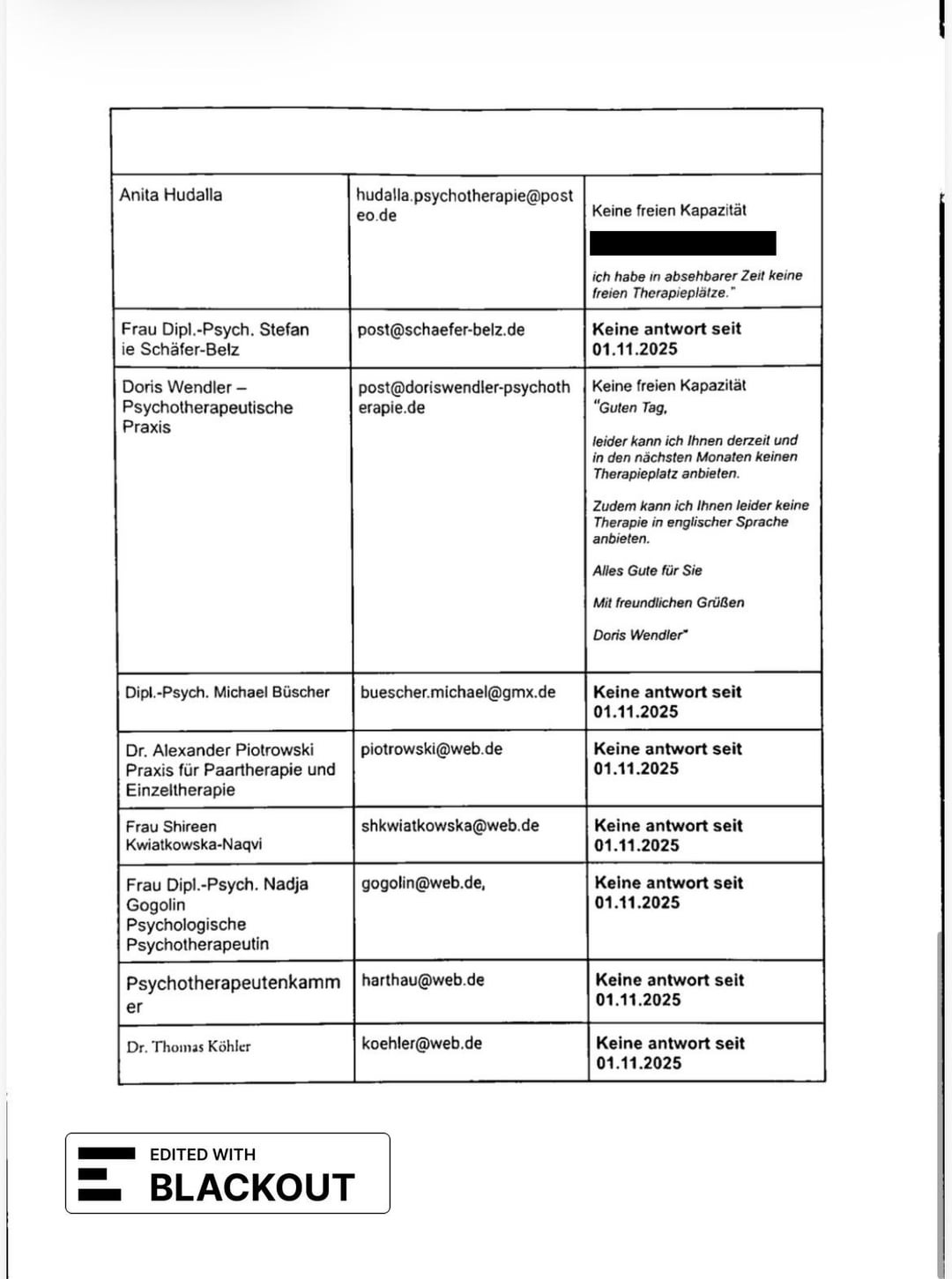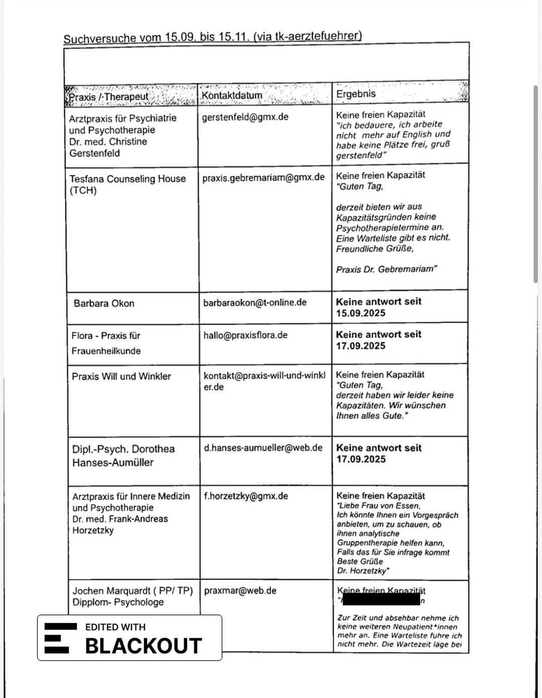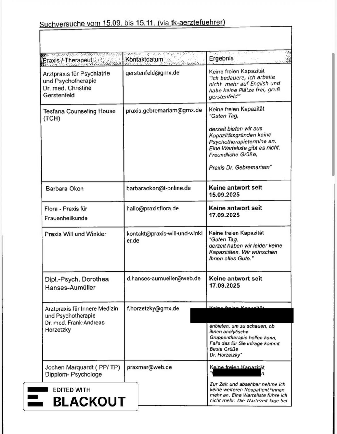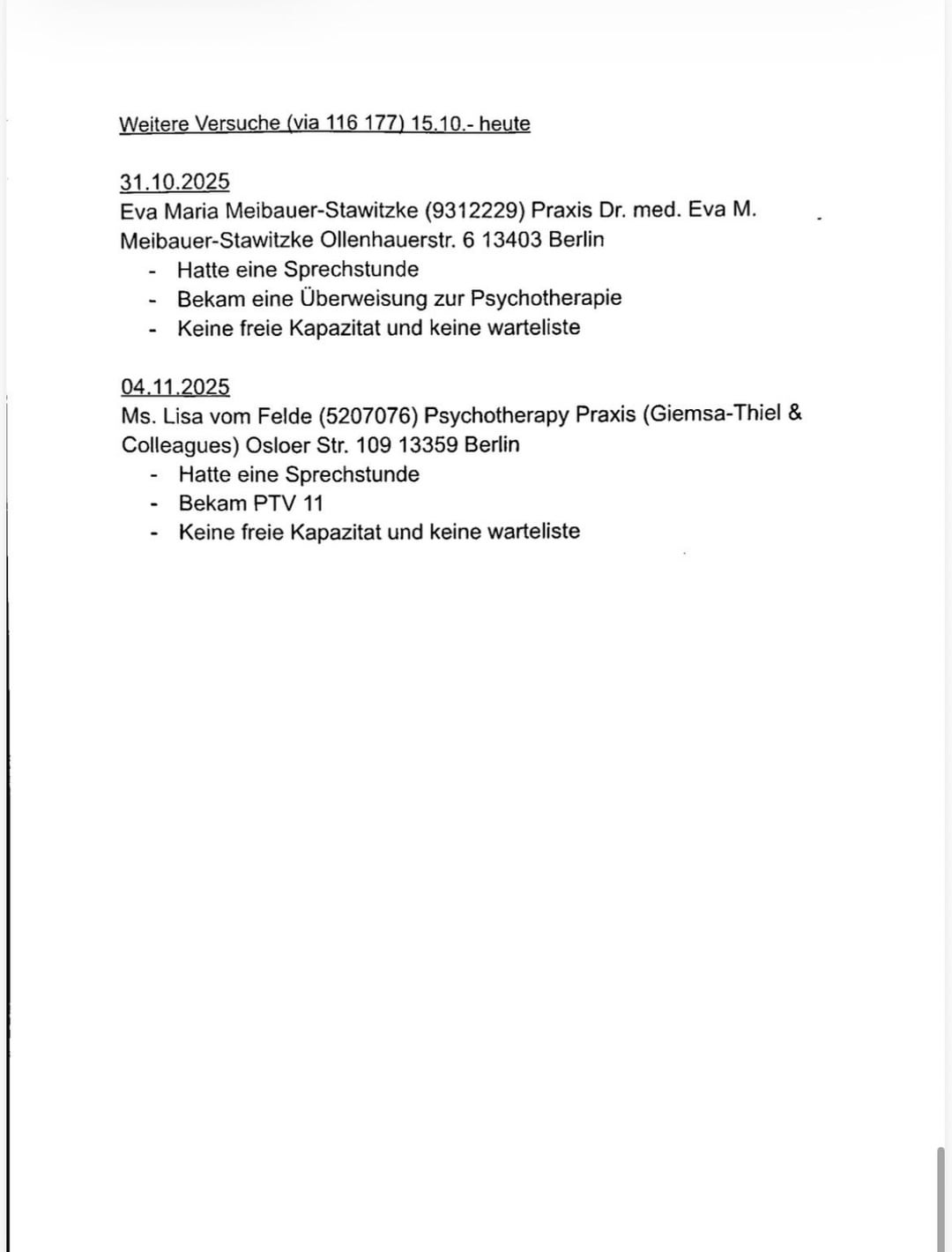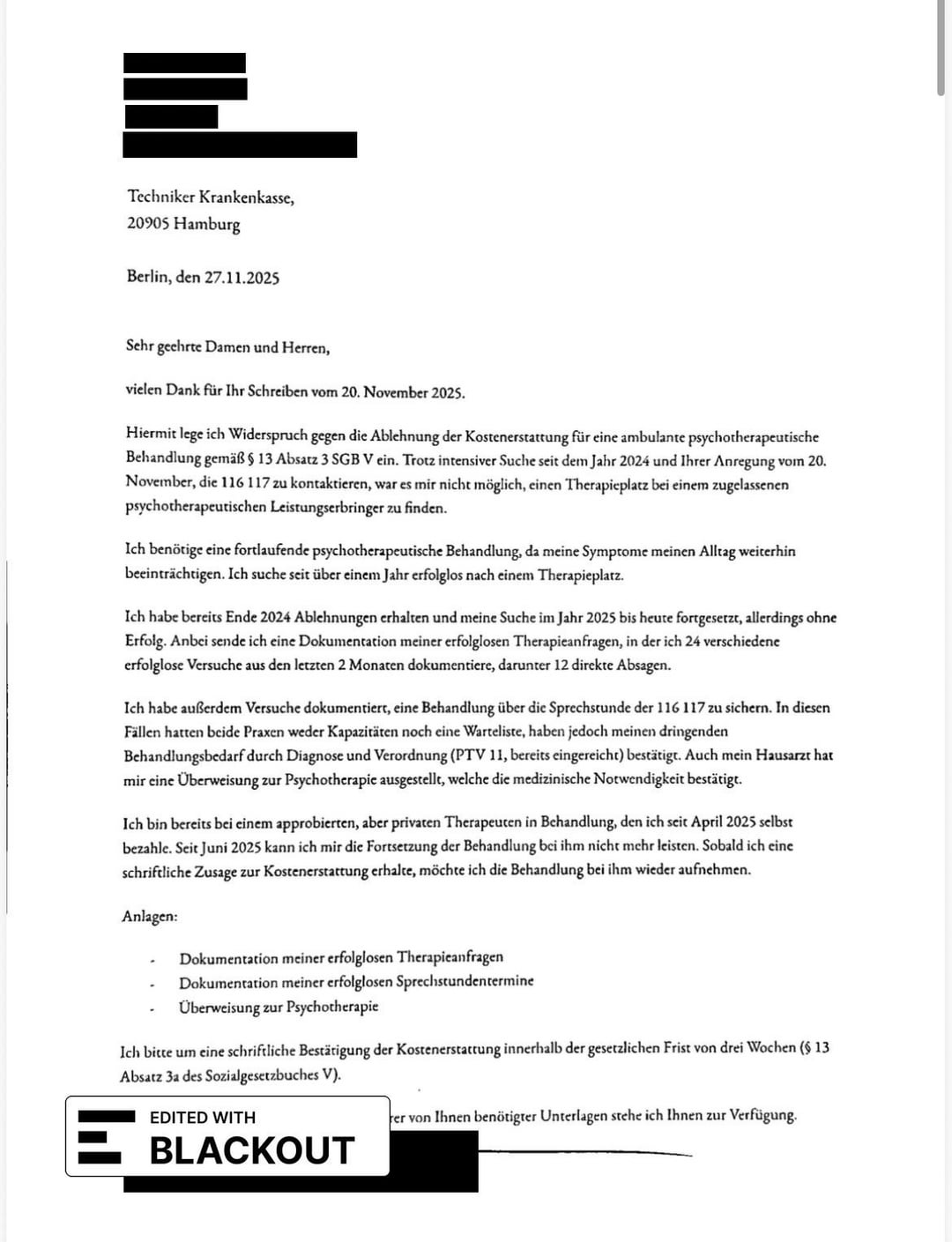 Within 2 months, I documented 24 rejections/request attempts, 2 sprechstunde visits via 116 117, and 2 prescriptions for needed psychiatric care from my hausartzt and from an emergency psychiatrist. I submitted this documentation with my PTV 11 and an explanation of my case (need for therapy, no space in the practices covered by TK within 3km of me). They rejected it with the reason that there are over 50 practices under TK in my district, and that my search attempt of the last 6 months didn’t prove a system failure.