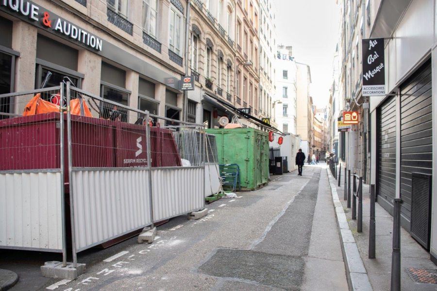 Rue Mulet, les bennes et containers des travaux dissimulent entièrement les façades des boutiques – Photo © Margaux Nourry – Lyon People