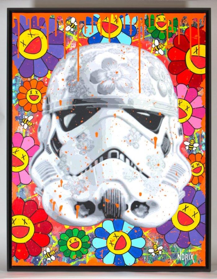 Il faut alors les suivre, tenter de déchiffrer leurs significations, pour atteindre enfin son antre, au bout d’un cheminement menant à un grand rideau blanc. D’un côté, des étagères garnies de bouquins vantant les mérites de Gauguin, Monet, Redon, Cézanne et autres Pissaro. De l’autre, des planches à dessin. Ou plutôt des toiles, reconnaissables entre mille, tant elles mélangent la pop street art, des personnages de cartoon et les couleurs vives. « J’ai trouvé mon cheminement. Ça part toujours d’un élément principal, qui m’inspire ».