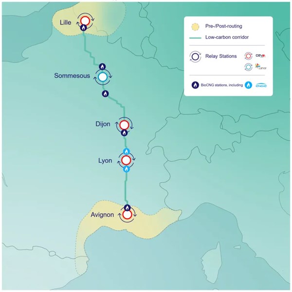 Cette initiative s’appuie sur des stations relais équipées de bornes de recharge électrique et de pompes de biogaz. Pour cette expérimentation, le trajet entre Avignon et Lille a été divisé en quatre segments, avec cinq stations relais : Avignon, Lyon (Rhône), Dijon (Côte-d’Or), Sommesous (Marne) et Lille (Nord).