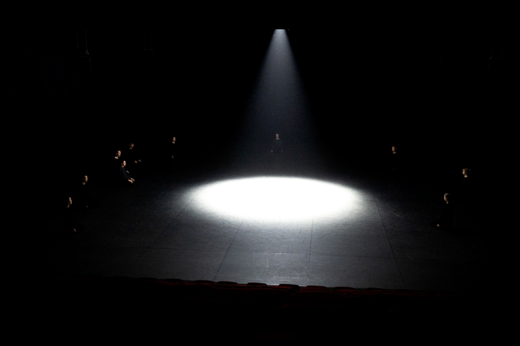 Quiconque connaît le travail de Nacera Belaza sait toute l’importance que représente pour elle la recherche de la lumière, notamment dans les ombres qu’elle crée en contraste. Avec La Nuée, la chorégraphe ne fait pas défaut à son identité, loin s’en faut, d’autant qu’elle se lance avec cette création dans une recherche inédite autour de la forme du cercle. Celle-ci s’impose dès les premières images, à peine perceptibles dans la pénombre créée par un unique halo de projecteur à faible intensité. Là, des silhouettes anonymisées par l’obscurité virevoltent, une à une, à la façon de derviches tourneurs qui semblent condamnés à ne jamais s’arrêter. Comme des insectes instinctivement attirés par la source lumineuse, les corps se multiplient par suggestion, leur solitude fait bientôt masse.