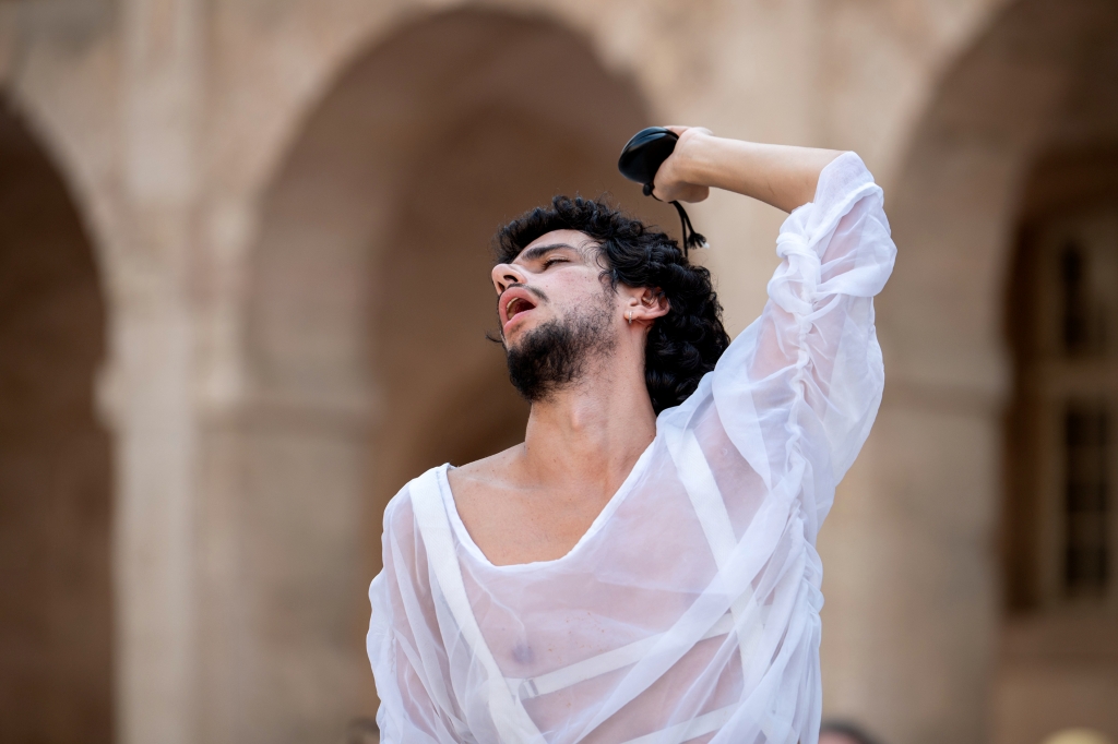 Sur les pavés encore chauds de la cour de la Vieille Charité, le contraste s’impose sans mal entre les pierres ocre des hauts murs et la silhouette du danseur enrubanné de blanc. Dans ce cadre, pourtant, les traditions entrent bel et bien en dialogue. Et pour cause, sur le plateau improvisé à ciel ouvert, Pol Jiménez convoque tout son héritage d’artiste catalan. Sans toutefois les reproduire à la lettre, les attitudes, les expressions et les castagnettes comme prolongement naturel des doigts ne trompent pas, d’autant qu’elles sont particulièrement maîtrisées. Comme la composition sonore vient faire vibrer le monument séculaire qui l’entoure, les danses traditionnelles dont s’inspire Lo Faunal se voient donc à leur tour bousculées par une interprétation personnelle et sincère.